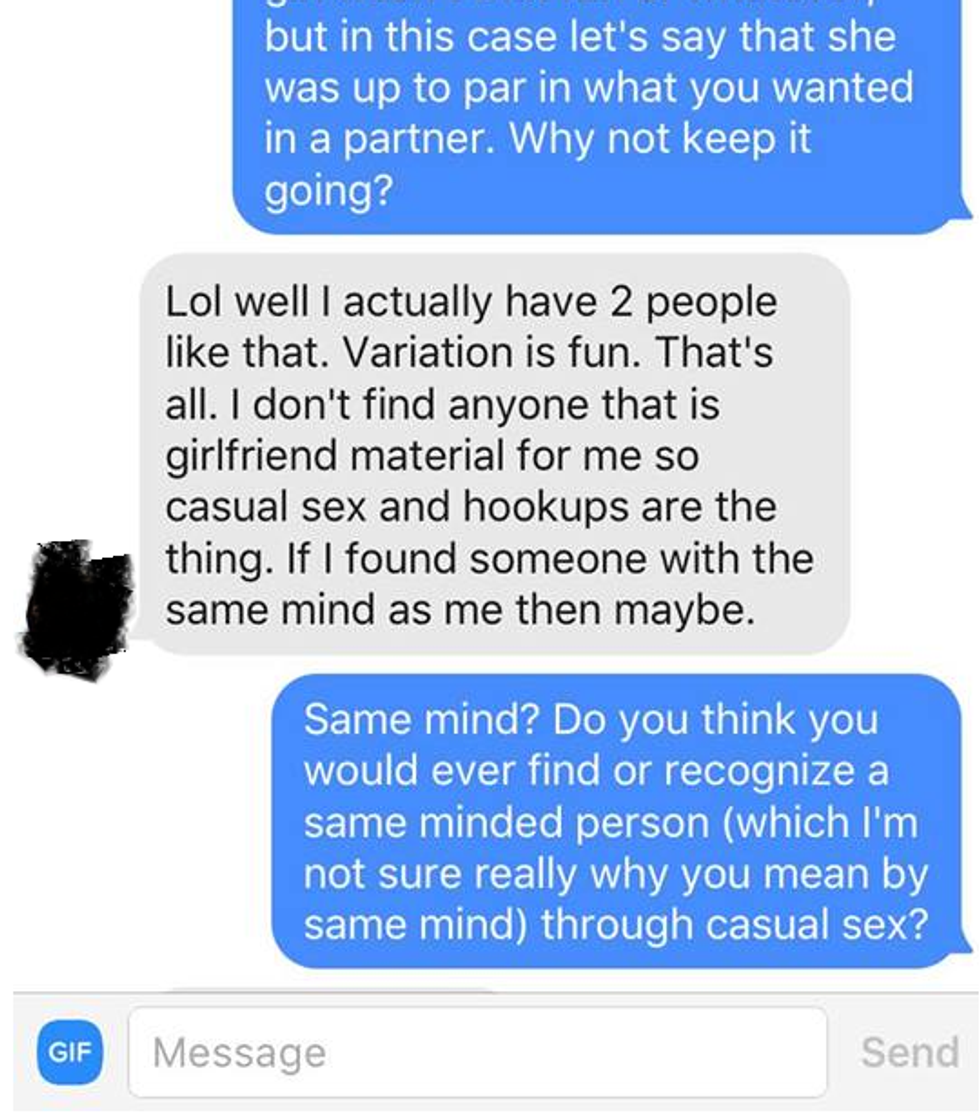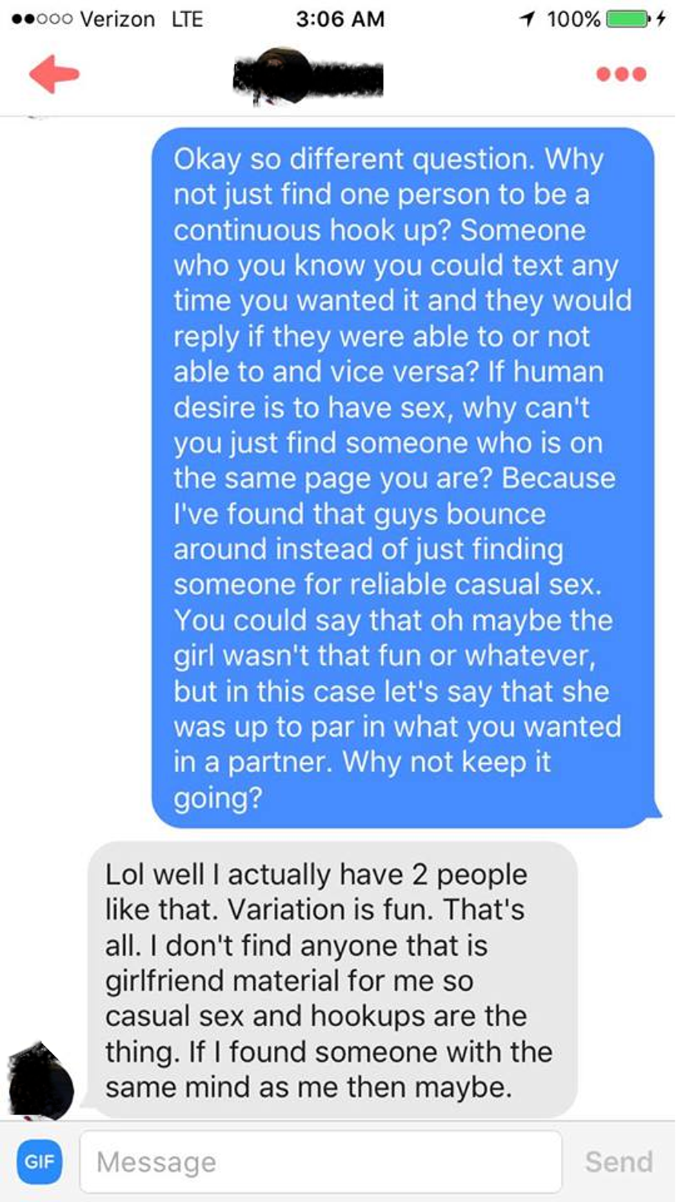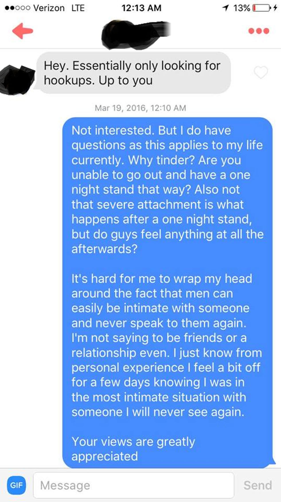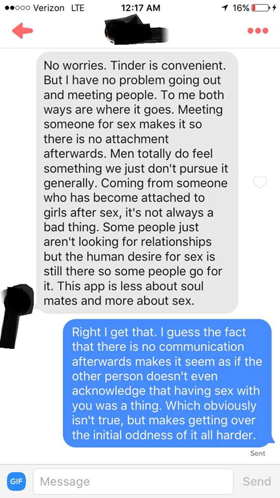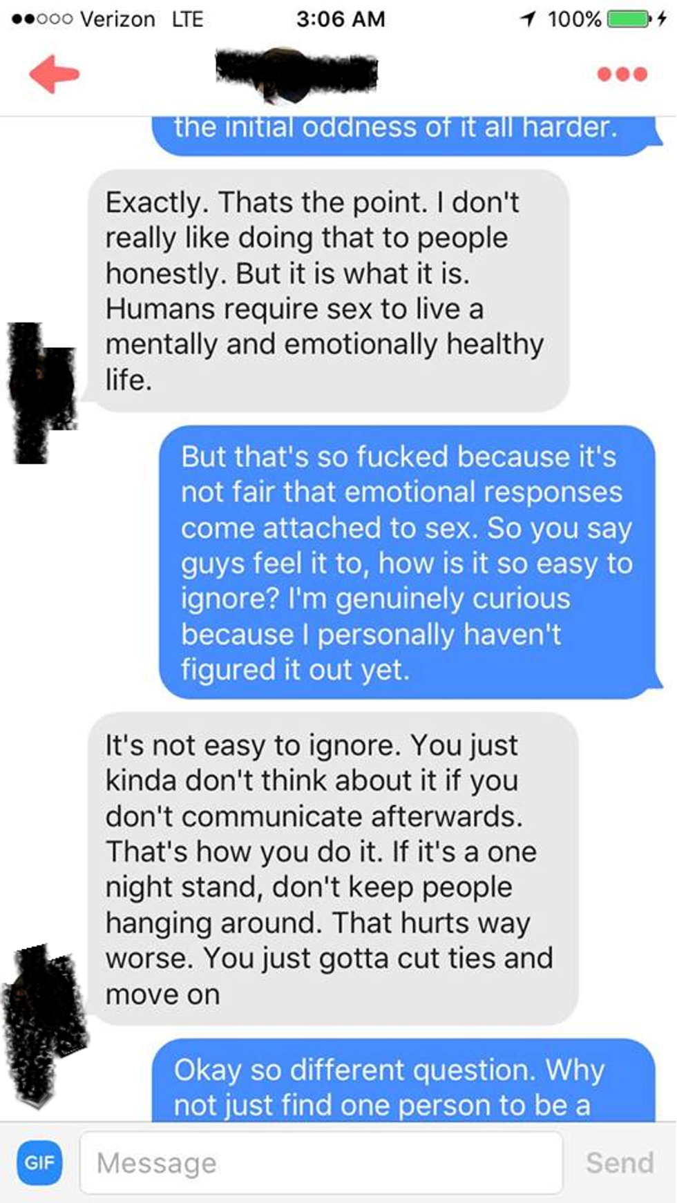 There I was, on a casual Friday night spent in my hometown, swiping on Tinder for the sole enjoyment of seeing people from high school and judging their profiles. Yet, when I got an unsurprising message of someone asking for a casual meet-up for sex, I kind of exploded on him. I don't know why I felt the need to ask this random person all the questions I had about the male mind. Maybe because I was only home for 12 hours and already was going insane out of boredom. Maybe it was because everything I asked him was just so relevant. I am not going to focus too much on my motives here, as there will never be a satisfying explanation. Regardless of why I wanted to, I did it anyway, and he was a good sport.