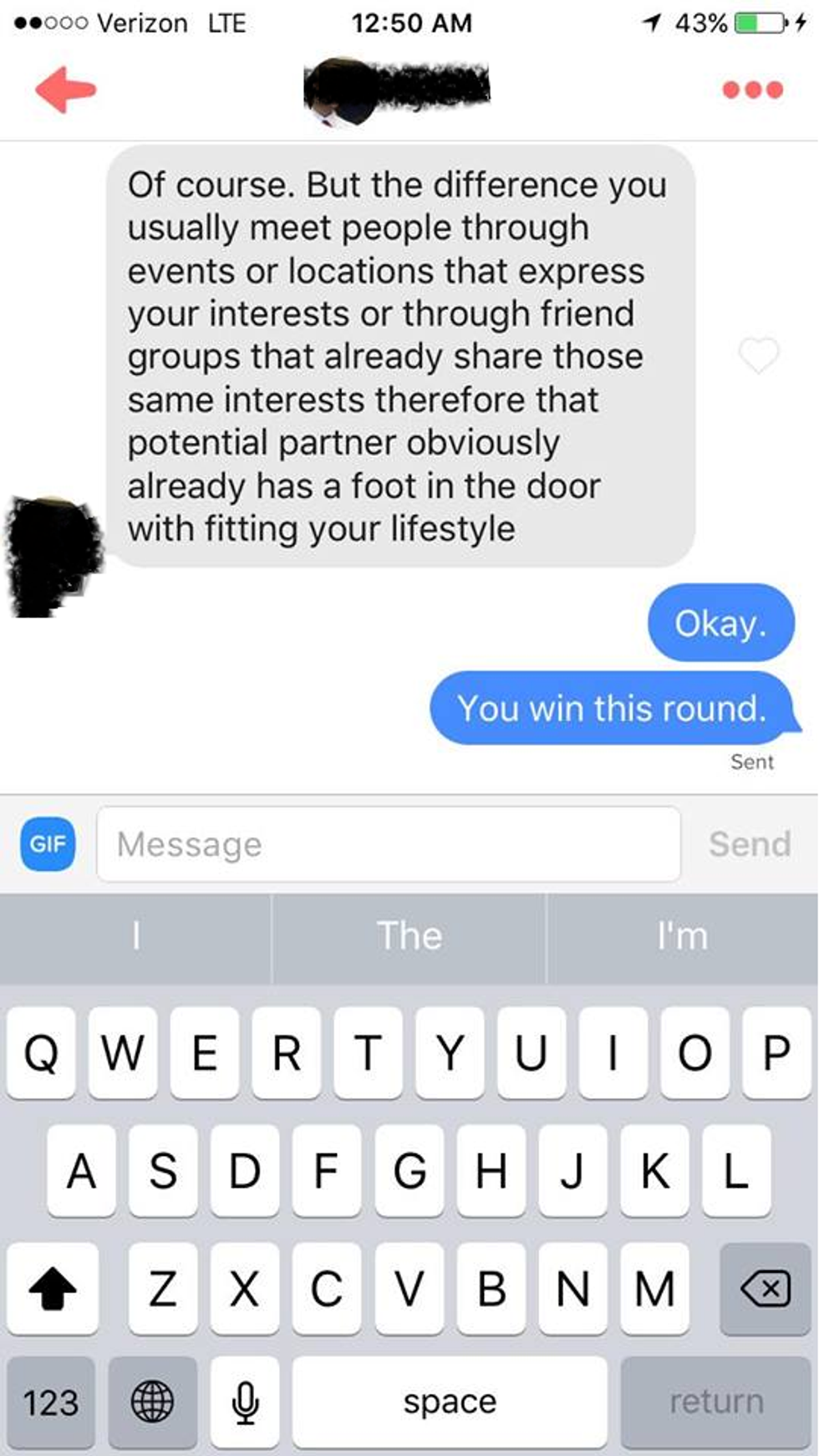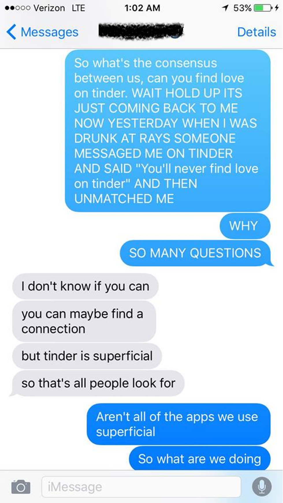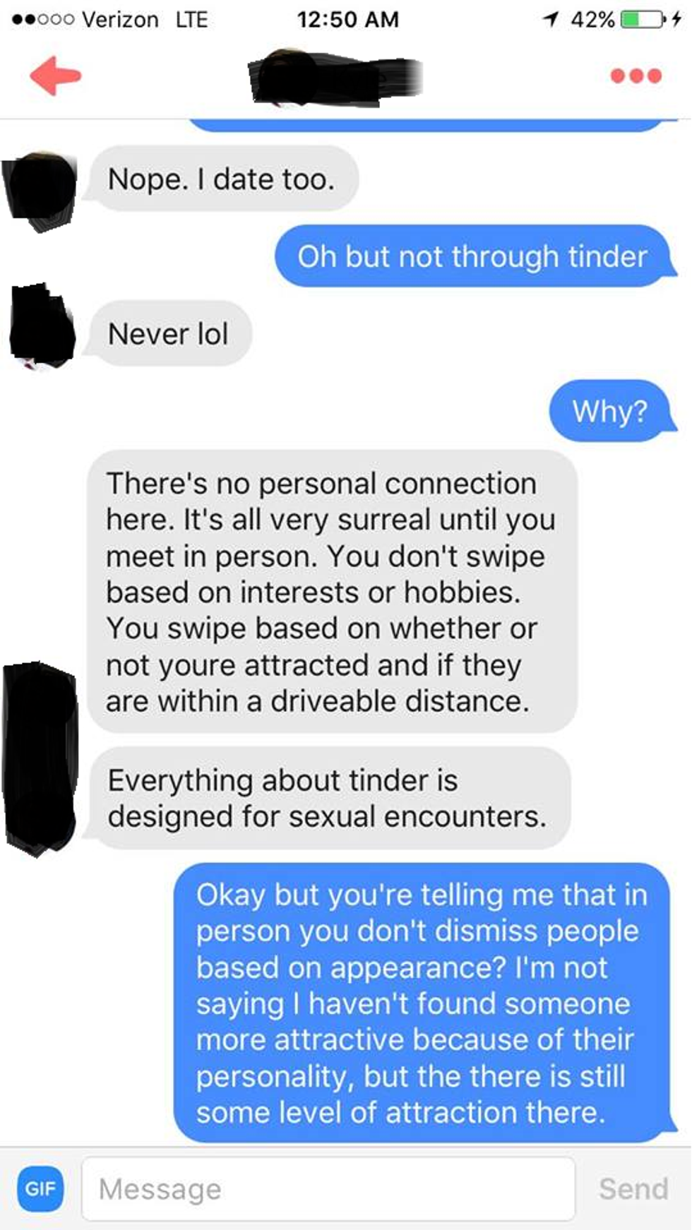 Before reading any further, though, I still would like to remind everyone, including myself, that this is just one person's opinions, and no one can speak for every user of the app. I know a lot of people who have actually found love on Tinder. However, I do feel that what he responds with is actually a common mindset for a range of users.