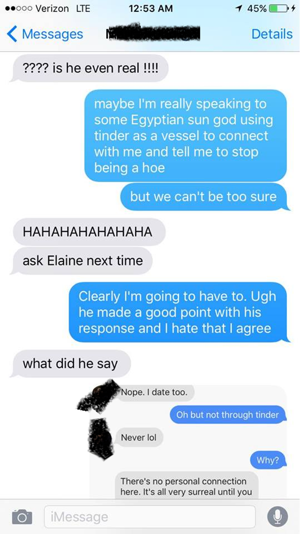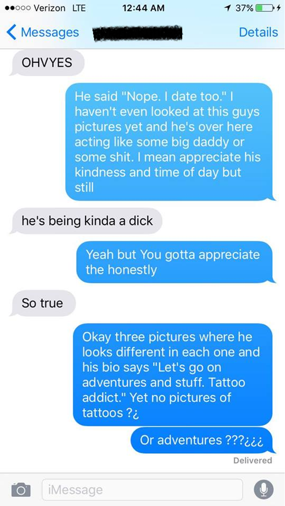 In the meantime, between messages, I broke down his Tinder profile for my friend, because for some reason, it took me this long to do so.
