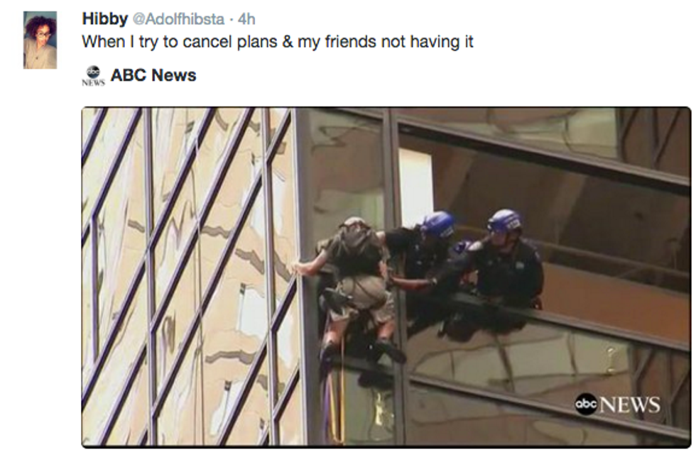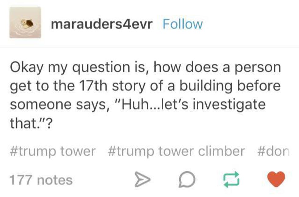This is Steve. Sometime between 3:30 P.M. and 4:00 P.M. on August 10, Steve began climbing the 58-story high Trump Tower based in New York... with suction cups.