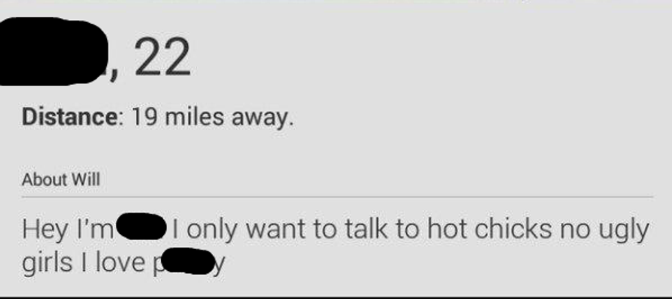 If you're trying to attract a girl, calling them b*tches, sl*ts, and other insults in your bio will not get you any matches. Saying "no fat chicks" is mean and unnecessary, just swipe left if you're not interested!