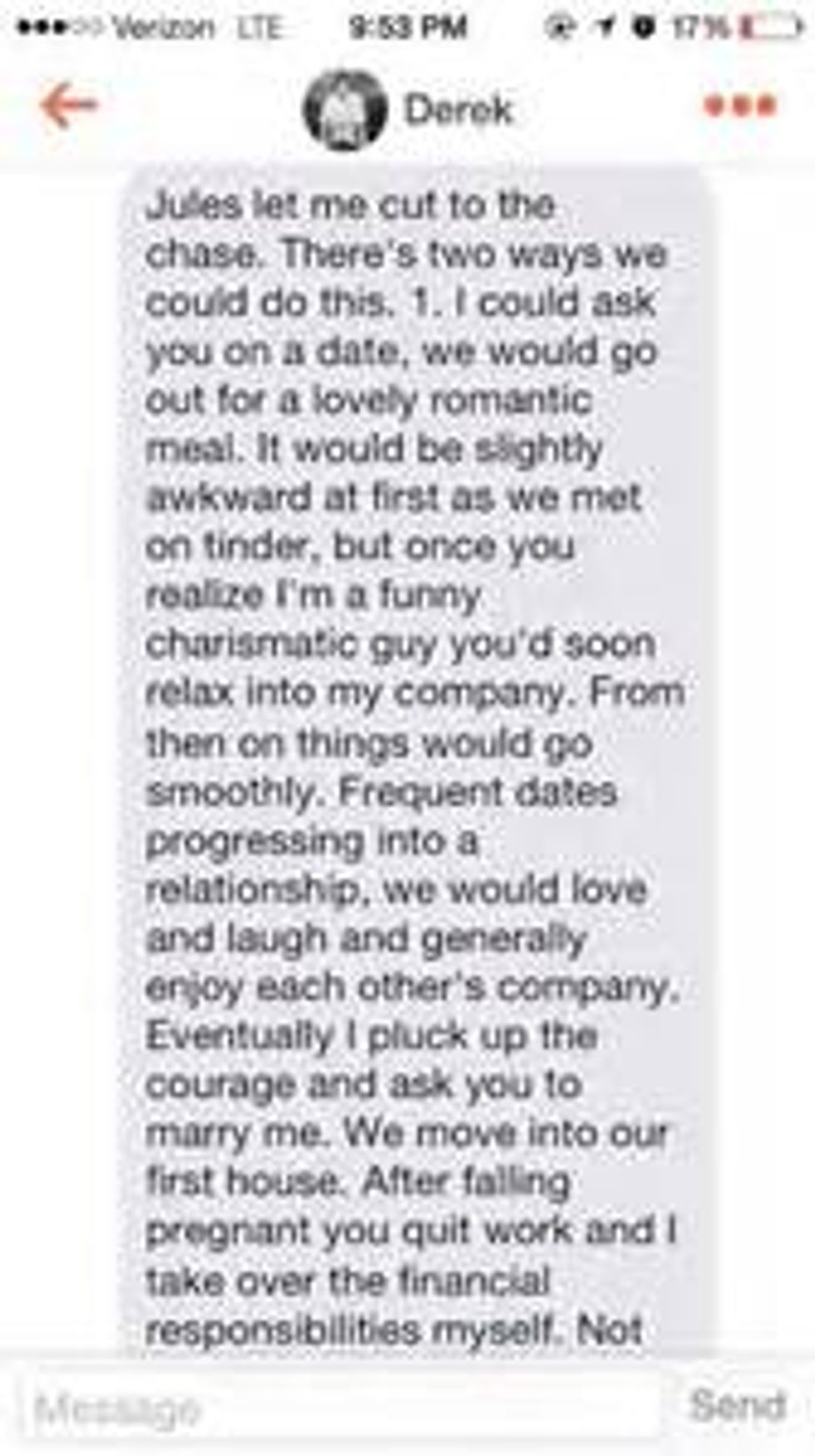 These guys take pride in sending you the longest message they can. Sometimes they are sweet sometimes they are gross… either way they are creepy. Just unmatch them and call it a day.