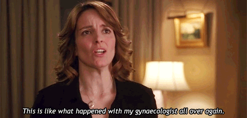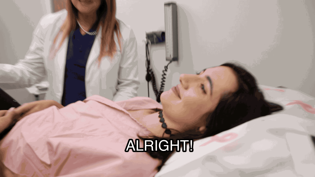 After a whole bunch of...prodding, let's call it, she does something inside me and I say, "ow." She goes, and I kid you not, "Oh, that's what it feels like for a man when his testicles are grabbed." Like oh my god. Why? Thank you because this wasn't awkward enough already.