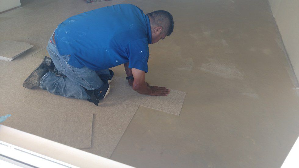 Marcos Sanchez lays the tile down carefully, ensuring that each square lines up perfectly with the others. Sanchez explained that they had previously laid the wrong tile throughout the house and he was currently fixing the situation—a project that he said could take about five hours.