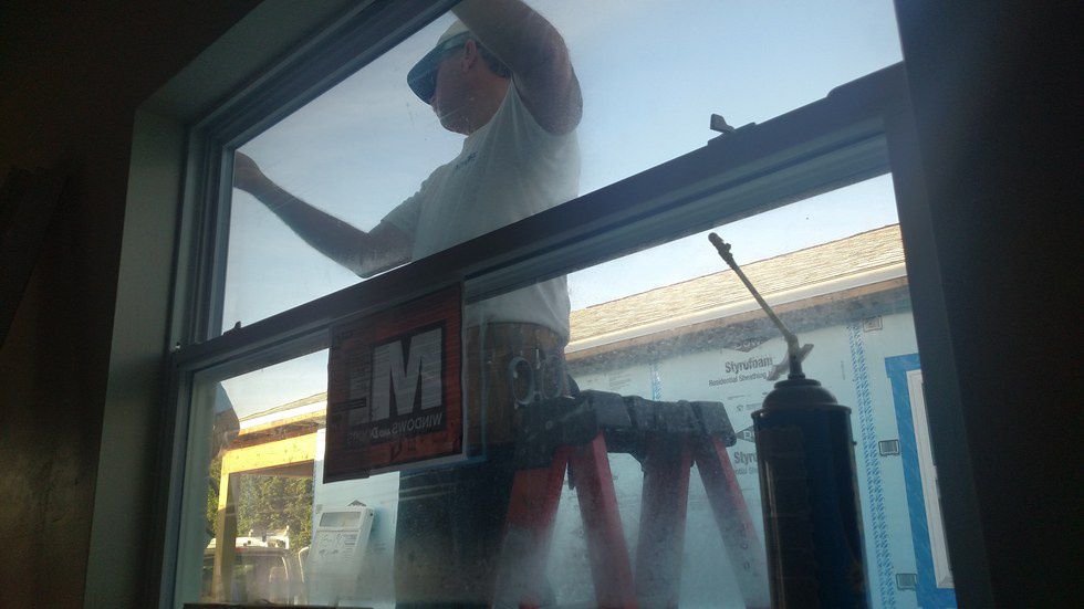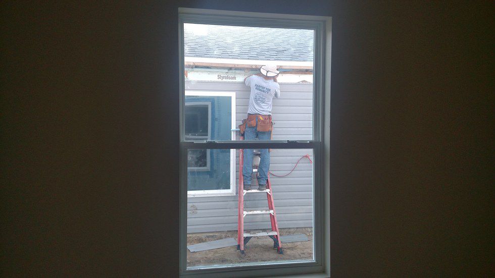 Jeff Mitchell, volunteer, stands on a ladder just outside the bedroom window of one house in the community. Mitchell is a retired fireman, “When I was a firefighter they always managed to take pictures of us when we were just standing around,” Mitchell said with a laugh.