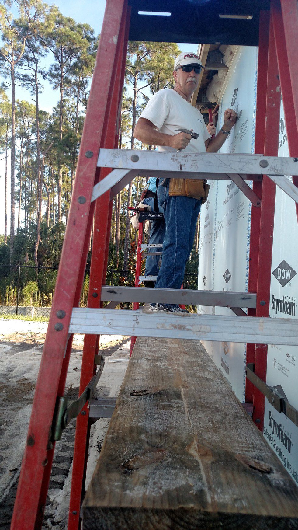 Scott Hill, left, and Jeff Mitchell, right, strategically move the ladders to access more of the house. The two were clearly no strangers to construction work.