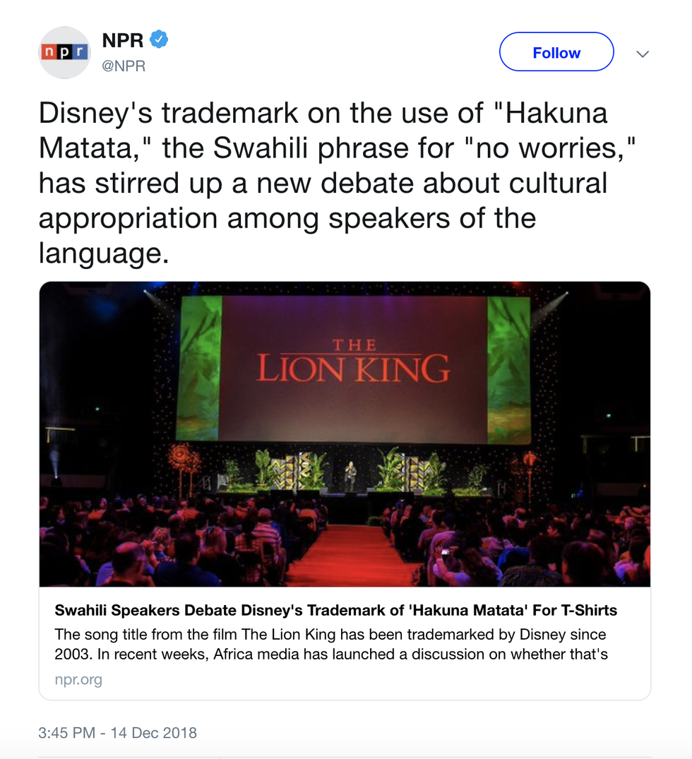 I do not think the underlying message of these petitions is that "The Lion King" is cultural appropriation, but rather the copyright of "Hakuna Matata" perpetuates the feeling that Disney, an American corporation, is exploiting a piece of Eastern African culture and language. Both arguments that support or oppose the online petitions are fair perspectives, but everything depends on awaiting for Disney's response.