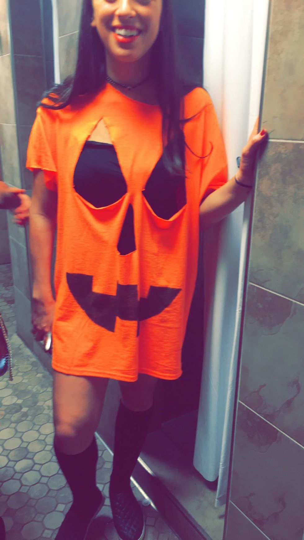 I couldn't contain my excitement about Mel's beautifully executed costume compilation. It's simple and sweet - displaying a nearly perfect Trendy to Basic ratio, splashed with a hint of aggressive IDGAFness that exudes confidence and comfort, all the while expressing the inalienable Halloweekend right to neglect wearing pants in public. The pumpkin's booby eyes are just a bonus, adding to Mel's genius. Bippity Boppity Boo. Ten out of ten would recommend.