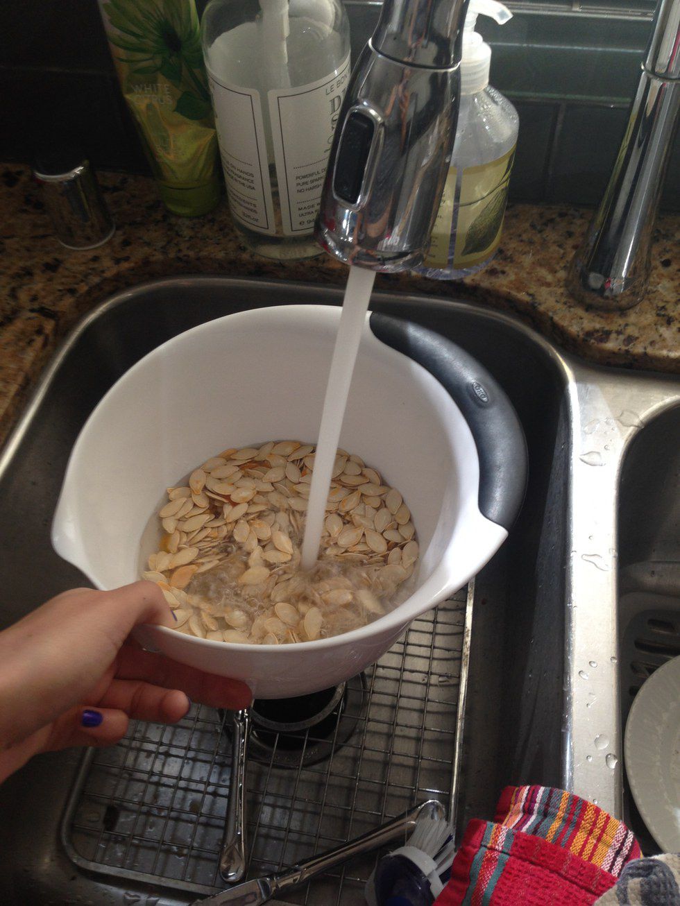 2. Wash the seeds in a bowl, in water, and pick out as much of the stringy bits as you can