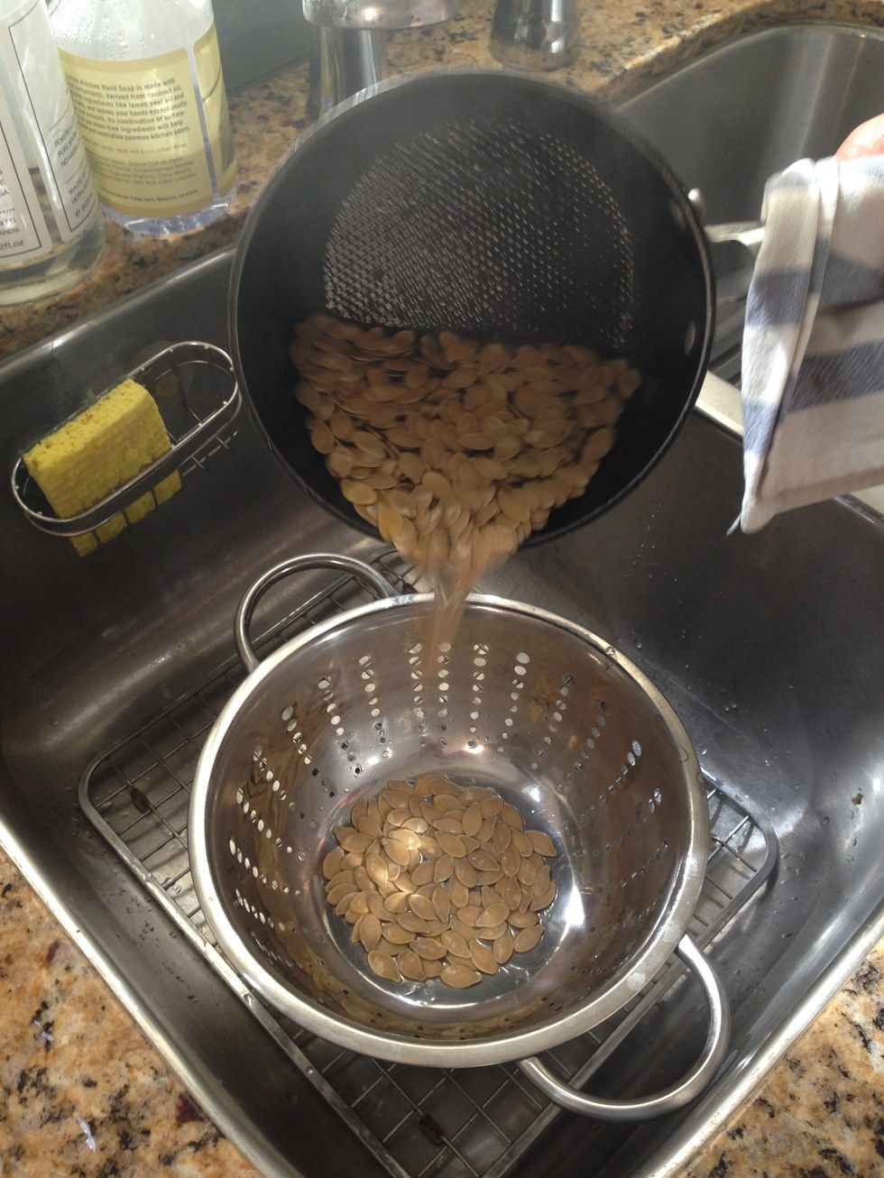 4. Drain in a sieve and spread the pumpkin seeds out on cloth to dry (not paper towels-- they'll stick)