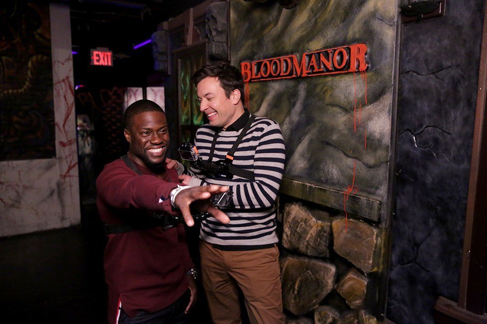 Now the last time that Kevin Hart was on The Jimmy Fallon show, they were at Universal Studios riding "Rip Ride Rock It!" and the world saw Kevin Hart basically have a heart attack (he also has a fear of roller coasters) and I have to admit, that was funny, but this stunt was by far the funniest I've seen. It was so funny that I could have peed myself from laughing so hard (don't worry, I didn't). The kind and spooky people at New York City's most coveted haunted attraction, Blood Manor, invited Jimmy Fallon and Kevin Hart to experience the most terrifying attraction in New York. Watching Kevin and Jimmy walk through a terrifyingly haunted house where everyone has either a chainsaw or banging against something and creeping up on you, touching your legs, well if I went myself I'd literally have a panic attack (this I can verify is true because it happened on a tame hayride a few years back) because it's just that scary.
