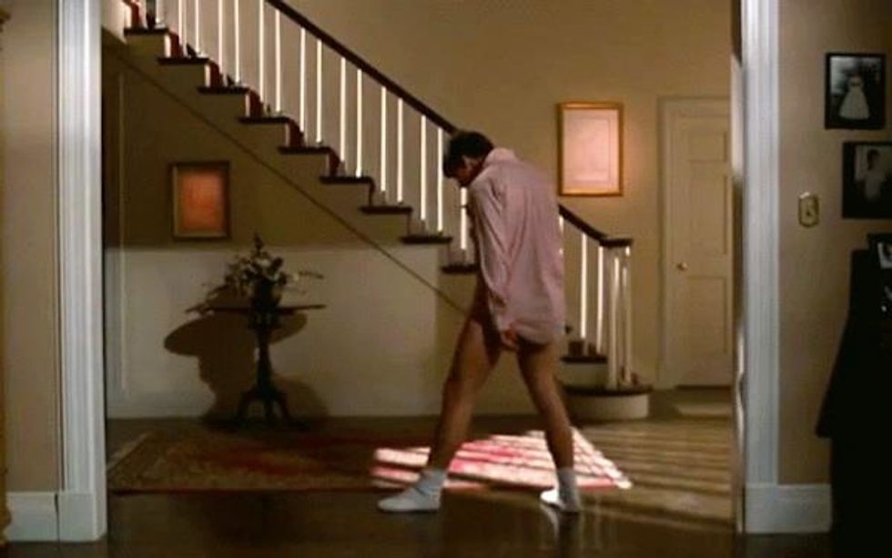 Borrow an oversized button-up from a friend and maybe bust out a pair of boxers. Then, last but not least, the socks that are all slippery so you can make your iconic entrance.