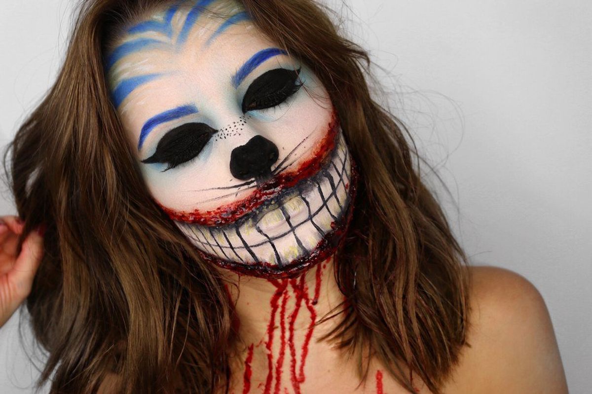 Cheshire Cat Halloween makeup tutorial with a little gory spin by Gina Ritacco.
