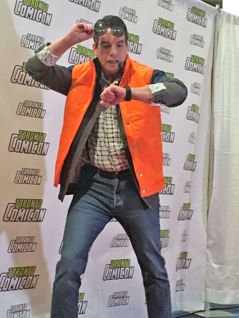 If you get an orange vest from the thrift shop, a blue and white checkered shirt, and some jeans you've got a fun Marty McFly costume!