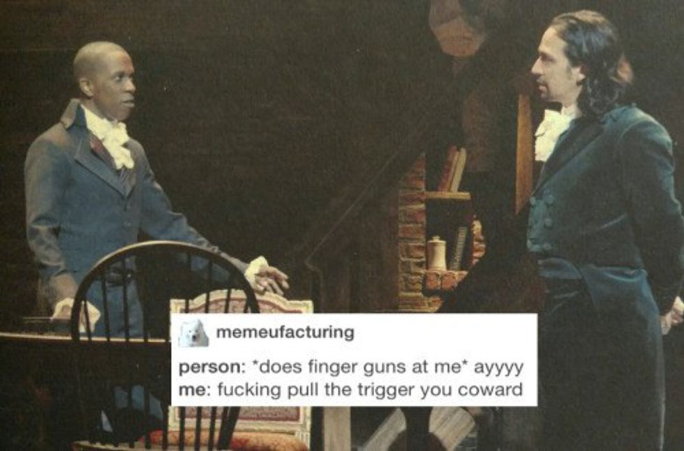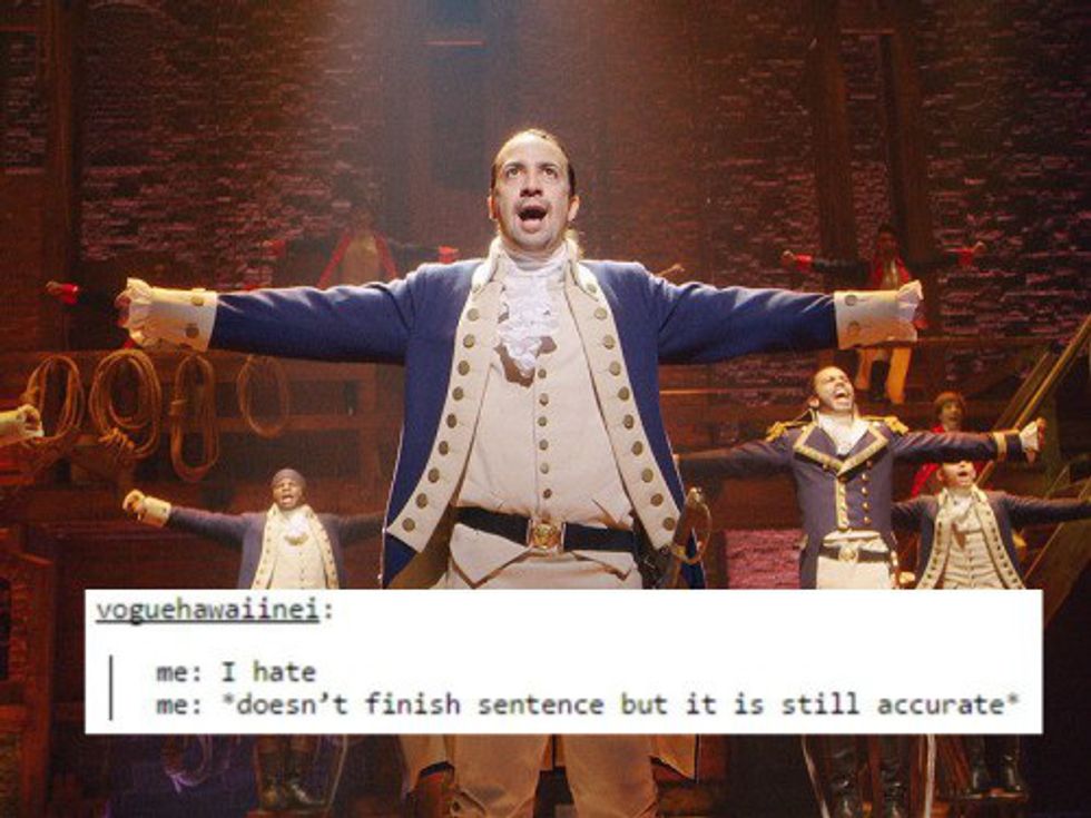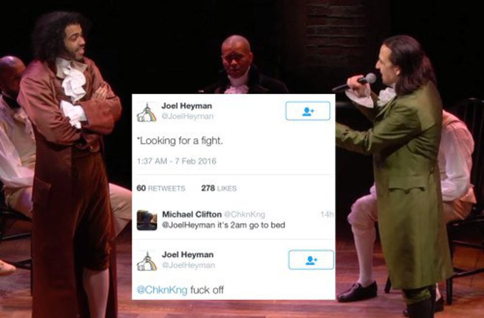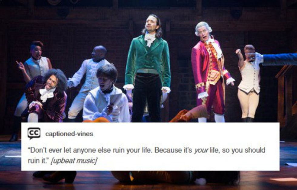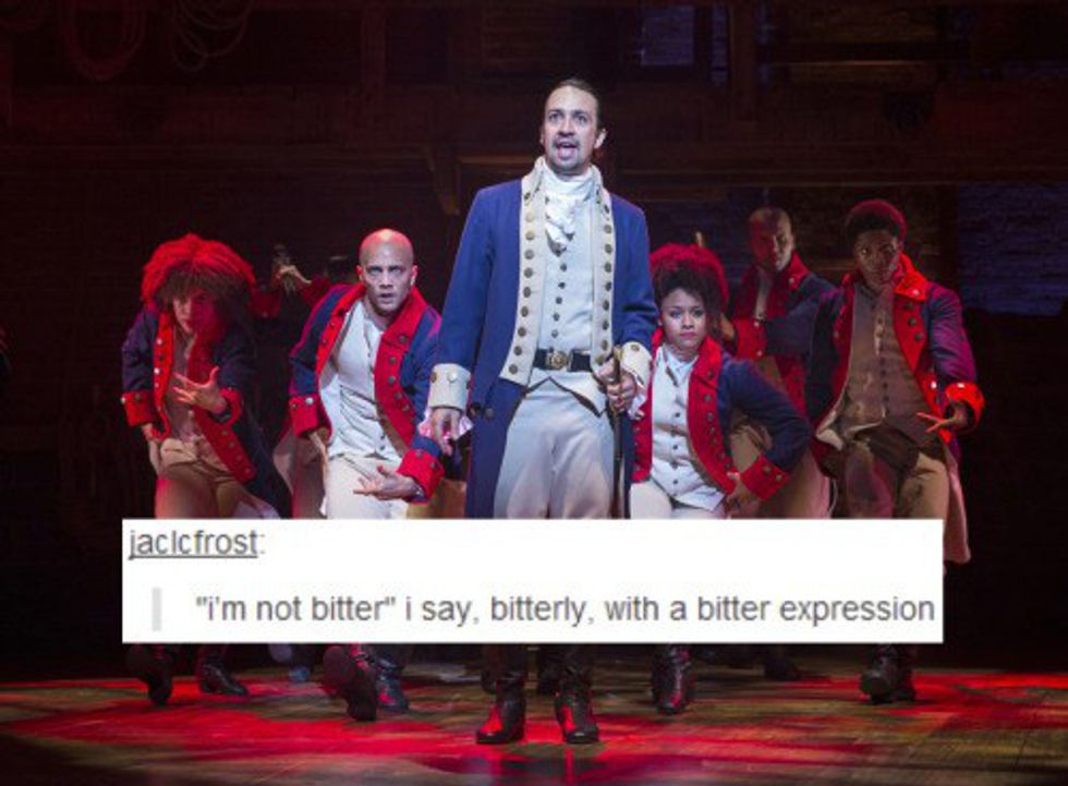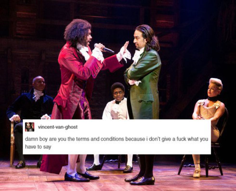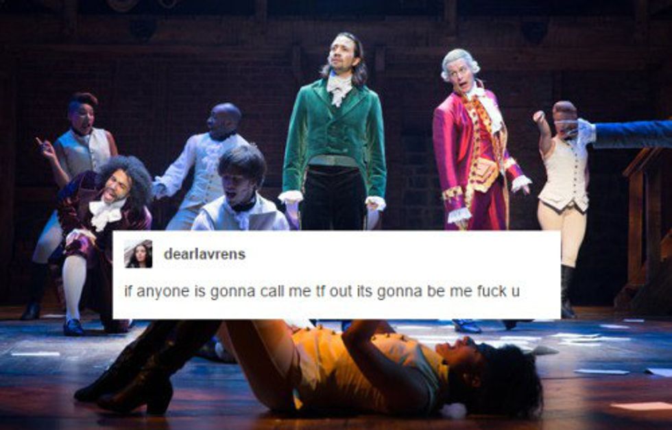 Thanks to bwuhbwuhbwuhbwuhbwuh on Tumblr, who posted the text posts overlaid on the Hamilton stills on her blog, I've picked a few choice posts and put them in chronological order of the show, so that if one comes across a friend who seems "kinda sorta interested but doesn't want to be overly invested" can still get a general idea of what it's about.