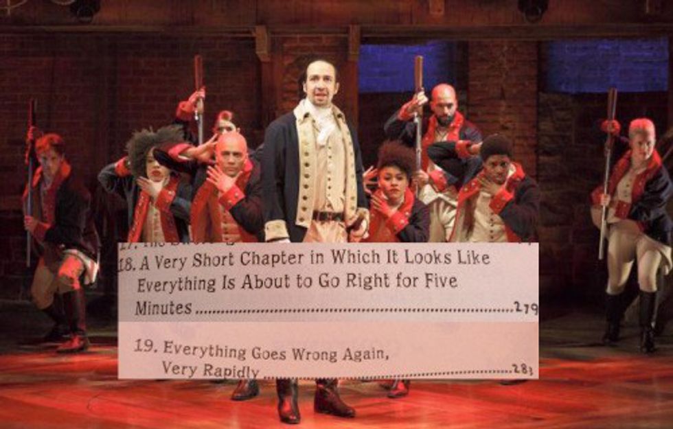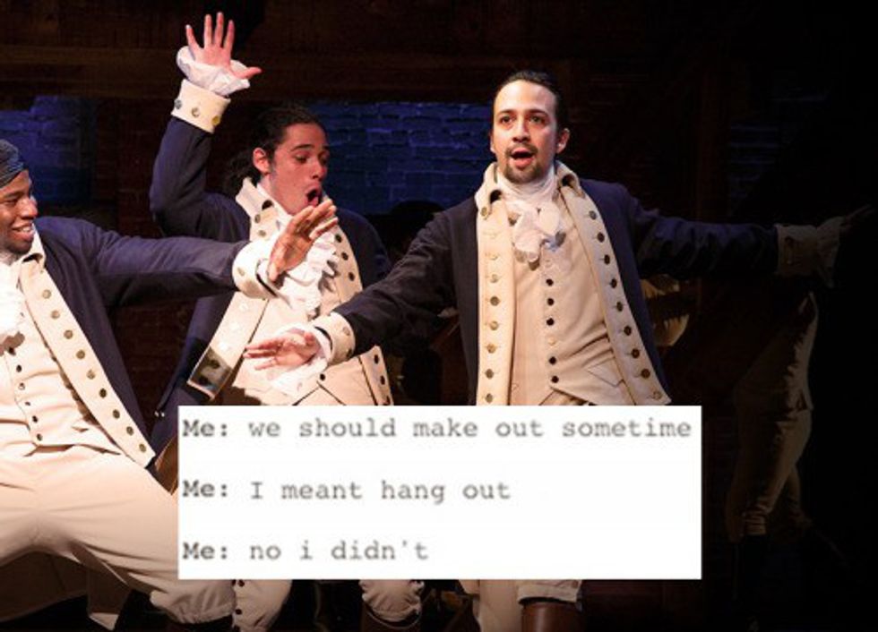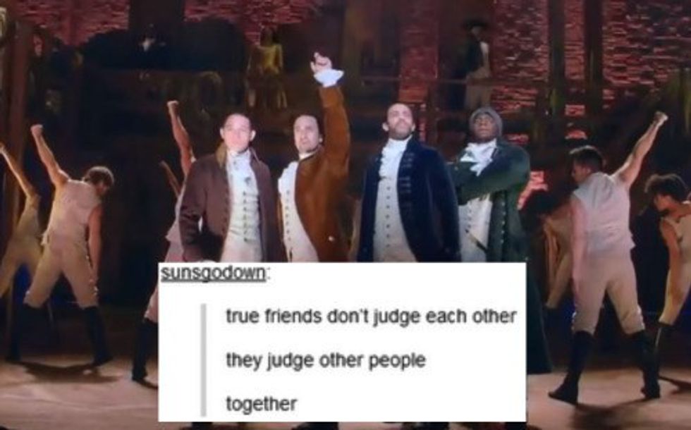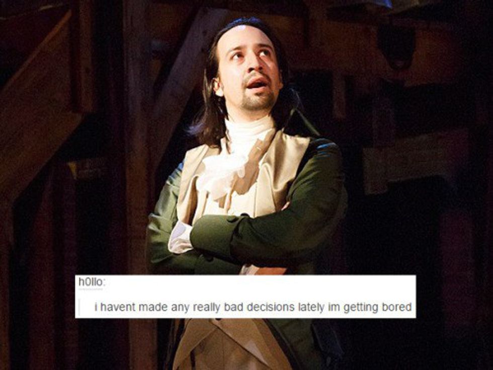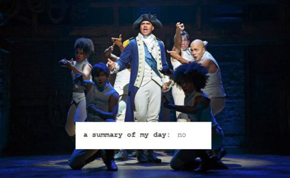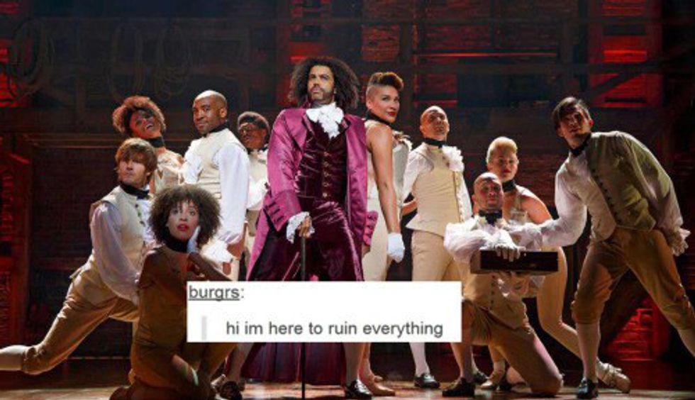 If you're like me, though, and you love "Hamilton" but have a few friends who are reluctant to give the cast album a listen ("Because, seriously, Broadway? Get a life!"), I have a solution. Rather than giving them a quick rundown as to the overall plot of the musical, which might come off as a little dry and give away potential spoilers, I have found a series of text posts compiled on top of pictures from the musical that are both funny and vague enough to keep people interested, but not give too much away.