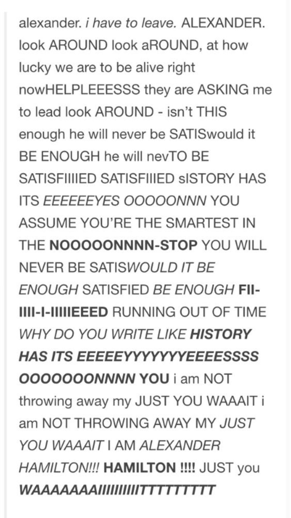 Why worry about the election of 2016 when you can be engulfed in the election of 1800? Hamilton is an epic musical that can help revive your hope in our country by reminding you of how hard we fought for independence. It covers everything from revolution, true love, forgiveness, betrayal, friendship, and politics. The perfect hero doesn’t exist in this musical, that's something that is made clear very early on. Every character makes their own mistakes. There is so much that I love about this musical. One of the best qualities of it, in my opinion, is the fact that it focuses on telling the story that forged the United States of America in a way that incorporates the way our country looks today. We are a mixture of different ethnicities and cultures coming together to form the fabric of our nation. The sooner we accept that, the sooner we can move on to realizing the full potential of the country so many men and women have dedicated their lives to. The world is wide enough for (both Hamilton and meee) everyone.