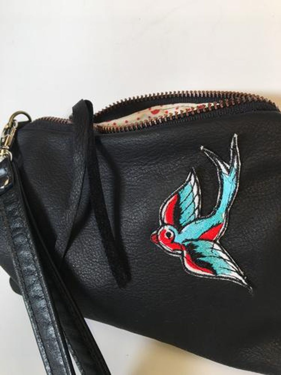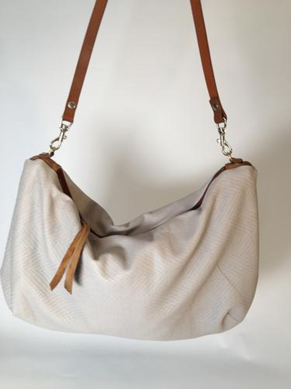 Since the beginning, Reneé has been an advocate for the use of recycled textiles to create simple and functional handbags. In a recent interview, she spoke about her love for up-cycling to Kate Sonnick, saying "I love to repurpose leather jackets. It is amazing to see an out of style (sometimes rather hideous) leather jacket become a beautiful bag, rather than ending up in a landfill." This focus on reducing waste in landfills and up-cycling vintage finds has enabled her to create a unique line of bags, of which no two are alike. Since each bag is individually crafted, custom orders are welcomed and celebrated. One beloved customer wrote Reneé after her handbag was stitched, "I decided to contact Songbird Sewing Company [regarding an almost thrifted purple suede skirt that belonged to my dear friend, gifted to her by her late sister] and partake in the talents of Reneé and her ideas for styling and color combinations. The completed skirt was perfect in every shape and form...I was beyond thrilled, and my friend, who will receive this on her upcoming birthday, will be too! Thank you Reneé, for superb workmanship and the personal tag says it all!”