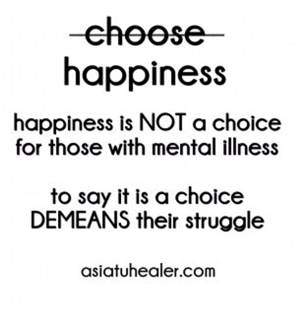Anger aside, I want the message in this article to be that happiness is not a choice. We simply don't function like that, and to tell people who battle depression that they have to only choose to be happy for it to work is absurd. The anger that it brought me pales in comparison to the indifference that statement has made others feel. As depressed individuals, we already feel like there is something - or a lot of things - already wrong with us. Don't tell us to add another one by making us think that for some reason we can't choose to be happy.