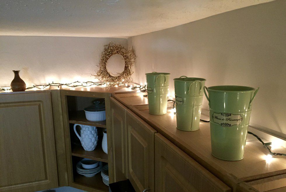 I added Christmas lights to the top of my kitchen cabinets to not only highlight the things I have up there, but also to create a warmth that draws guests in and makes them feel welcome. I am a huge Christmas fanatic, and if there's any way I can make Christmas linger throughout the rest of the year I am definitely going to do it!
