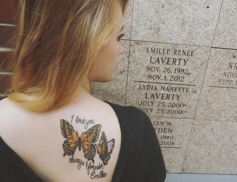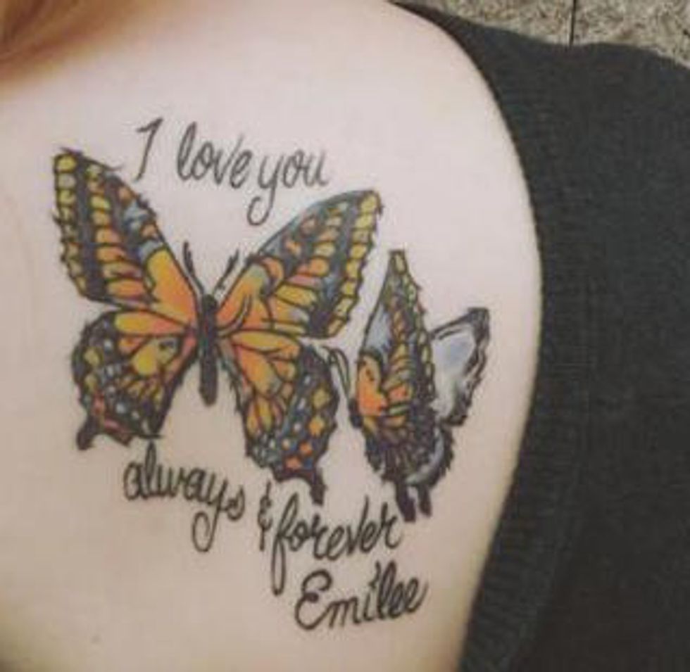 Don't talk to me about regrets. People seem to always secretly believe you'll regret your tattoos later in life. But Emilee's name is on my skin, just as it is appears, carved inside of me. I got to taste the pain she felt. I got to imagine what it was to know something was so close to your spine. And I placed our symbol of hope, our sign of sisterhood, our reminder of miracles, upon my skin forever. Those monarchs are what we somehow saw every time we went for a walk. Those wonderful walks I wish I could relive, full of hugs and tears, of fears and prayers, of love, and most importantly, of laughter.