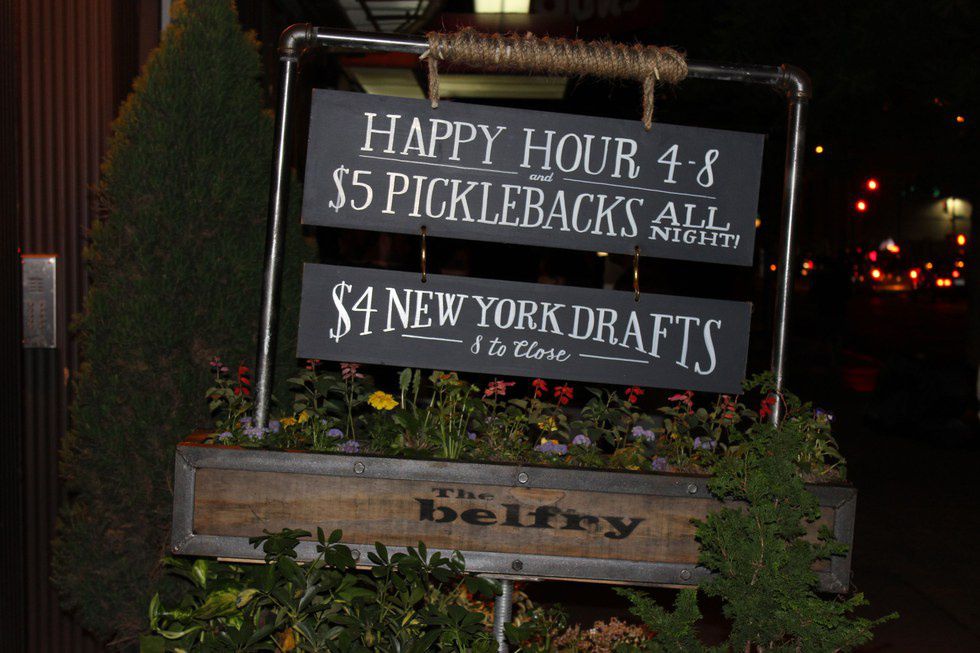 The Belfry is known for its super cool and cozy atmosphere, complete with hanging twinkly lights and pints of guinness. Happy hour on weekdays includes $2 off NY Draft and $2 off cocktails.