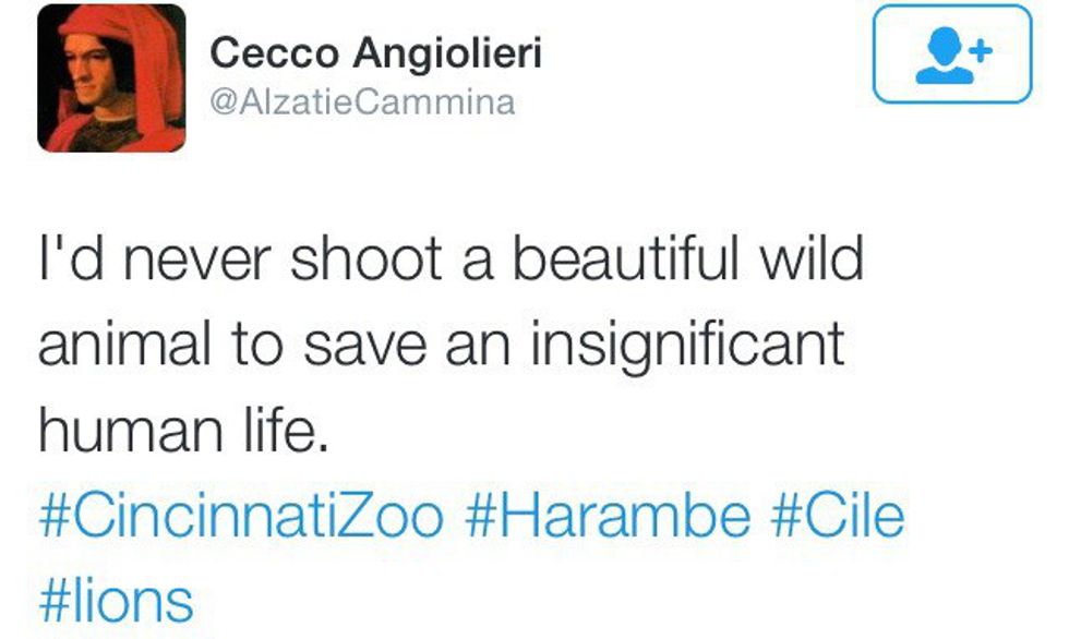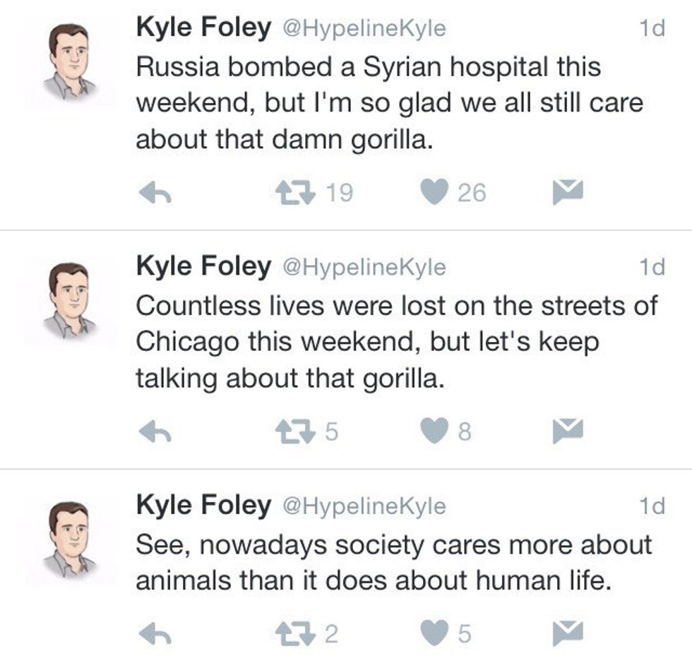 It is unfortunate and a shame that an endangered silverback gorilla had to be killed and that both lives could not be saved, but it was the only available option in a time of crisis when it came to protecting the life of a human - a child. In the end, human life should and will always take higher priority over animal life. The two do not compare. So, the next time you hear of an innocent shooting on the streets, a terrorist attack, or any other deathly act of violence against human beings, don't simply brush it under the rug like it's no big deal. It is a serious problem, and people should be talking about it with passion the way people are fighting for Harambe. Why has our lack of respect for human life been stepped on and scraped across the pavement into disintegrated bits of nothingness?