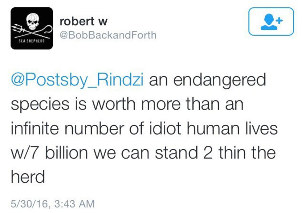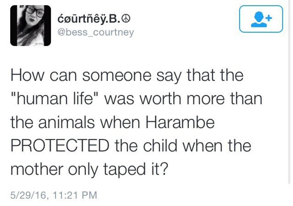 The following are tweets and posts found in the Justice for Harambe Facebook page, showing how certain people feel about the sanctity and standard of human life concerning Harambe: