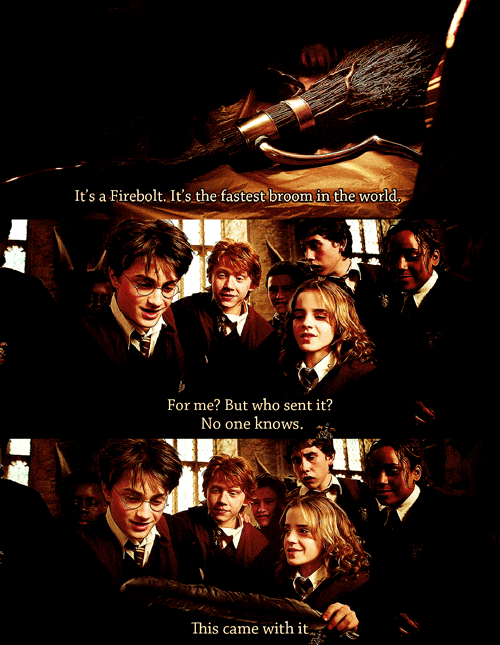 Poor Harry's Nimbus 2000 got destroyed by the whomping willow, but a "mystery" person comes in clutch and sends him a Firebolt. Suck it, Malfoy and your mediocre Nimbus 2001.