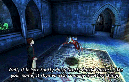Do you want to know why this is a gif from the video game? Because Peeves wasn't even mentioned in the films at all! This was one of my biggest upsets with the film franchise. Peeves is one of my favorite characters in the entire series. Although a bit of a pest, he brought a certain comedic aspect to the book series as a whole. The poltergeist agreed with most of the student body at Hogwarts when Dolores Umbridge took over and spent the majority of the year (much like the Weasley twins) causing mayhem and mischief everywhere by pranking her until she eventually was kicked out of the school.