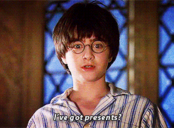 Setting is Christmas party: Hagrid bringing in the Christmas tree, Flitwick decorating it, Ron and Harry playing chess with the tree in the background, the actual present-opening on Christmas morning