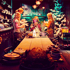 Setting is Christmas party: Celebration at the Burrow and some at Hogwarts as well (the room of requirement "wet" kiss between Harry and Cho Chang under the mistletoe)