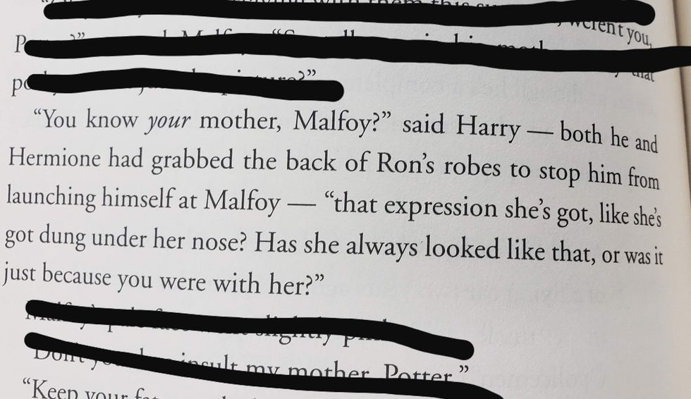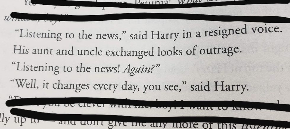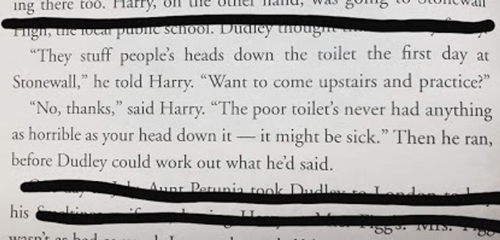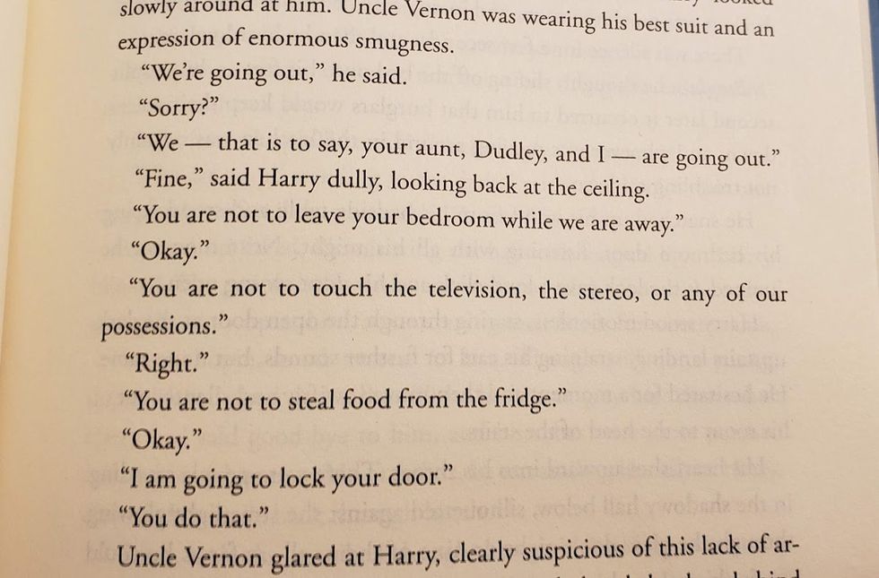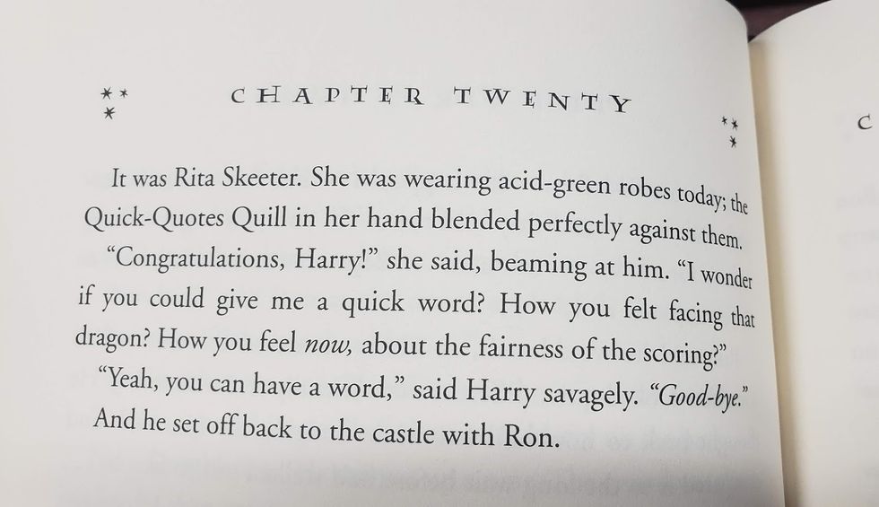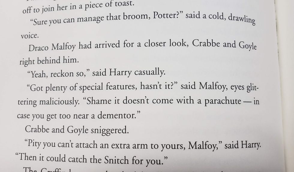 The "Harry Potter" books had some pretty good lines, many of which never made it onto the screen. "Have a biscuit, Potter" and "There's no need to call me sir, Professor" are among the greats. Of course, then there's Dumbledore CALMLY asking Harry about the Goblet of Fire.... Whenever you hear that line, just remember, "it does not do to dwell on dreams and forget to live." Forgive and forget.