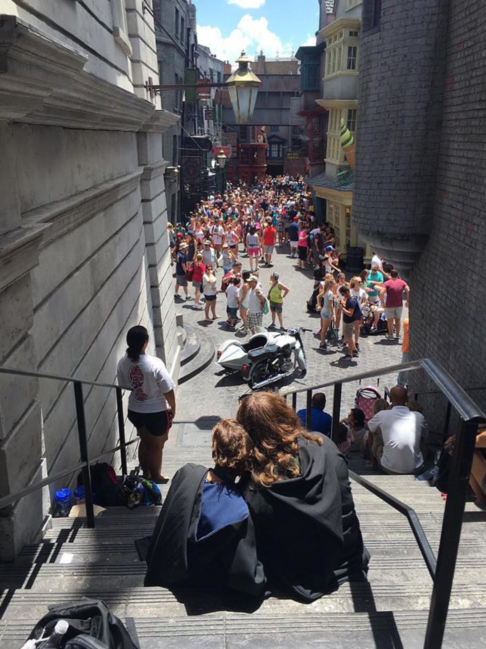 Like finally finding "Our Spot". There's this staircase in Diagon Alley that we could sit there for hours and just drink ButterBeer and eat Strawberry PeanutButter ice cream. After going 2-3 times a week for weeks on end and never leaving the Harry Potter Bubble, people would often ask us if we got tired of the same 5 rides. And the answer is no. We didn't go for the rides or the stores or the food- we went for the feeling we got. There's no better feeling than finally turning the corner and seeing Hogsmeade or Diagon Alley. There's no better feeling than sitting on the top of the stairs in Diagon Alley and seeing people's reactions to seeing the dragon for the first time or seeing a child receive his or her first wand or seeing people cry because they feel the same as we do. It's the spot we came upon after we received our wands so we could really take a look at them. We would spend hours in this same spot and just talk and watch people's reactions. This is the spot where we grew closer. This is the very spot I knew I was in love with this girl. It's the spot where we held each other and cried when we knew we probably wouldn't be back for up to a year.