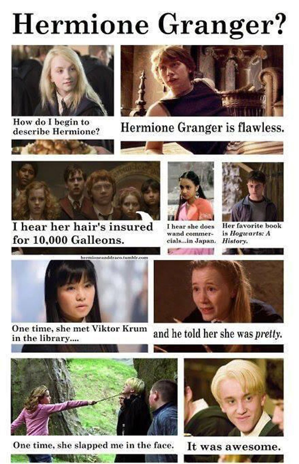 Hermione Granger is my favorite female character in the world. She is smart and brave, nerdy and beautiful, compassionate and strong. She embodies someone who was born into a group considered lower than others in her society, yet works just as hard to make themselves equal. She grew up with best friends who were the opposite gender, and managed to make it through relationship drama and her teenage years with her dignity still intact, which is more than I can say for many people I know.