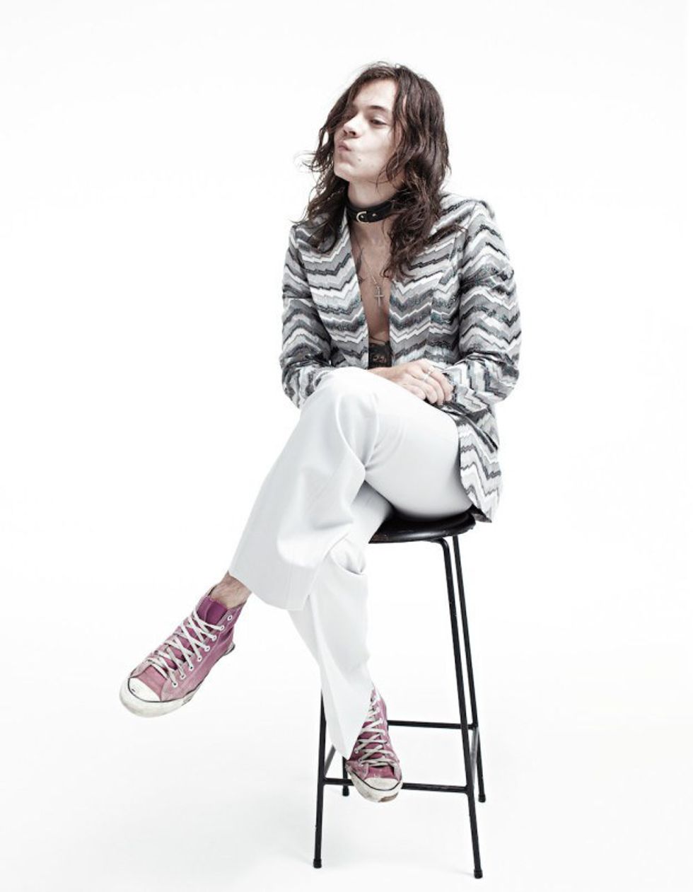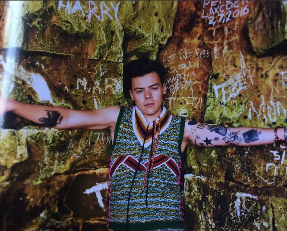 Once again here we have Harry with long hair sitting on a stool just looking like a rock god. This is where all of the fans start to swoon.As if our hearts couldn't take anymore, here we have Harry basically looking right into our souls and half crying, half smiling. Which is exactly what I want to do when I look at this picture.As if you thought I was done, we have this sweet little angel laying in a bed of flowers covering half of his face. It's like he wants us to cry over his beauty because just look at him. We must protect him at all costs.After seeing these I know this is everyone's reaction.There are about 20 more photos but I figured I would save us the paper bags we are breathing into and look at them another time because there is only so much art I can handle at once, and even this is too much.