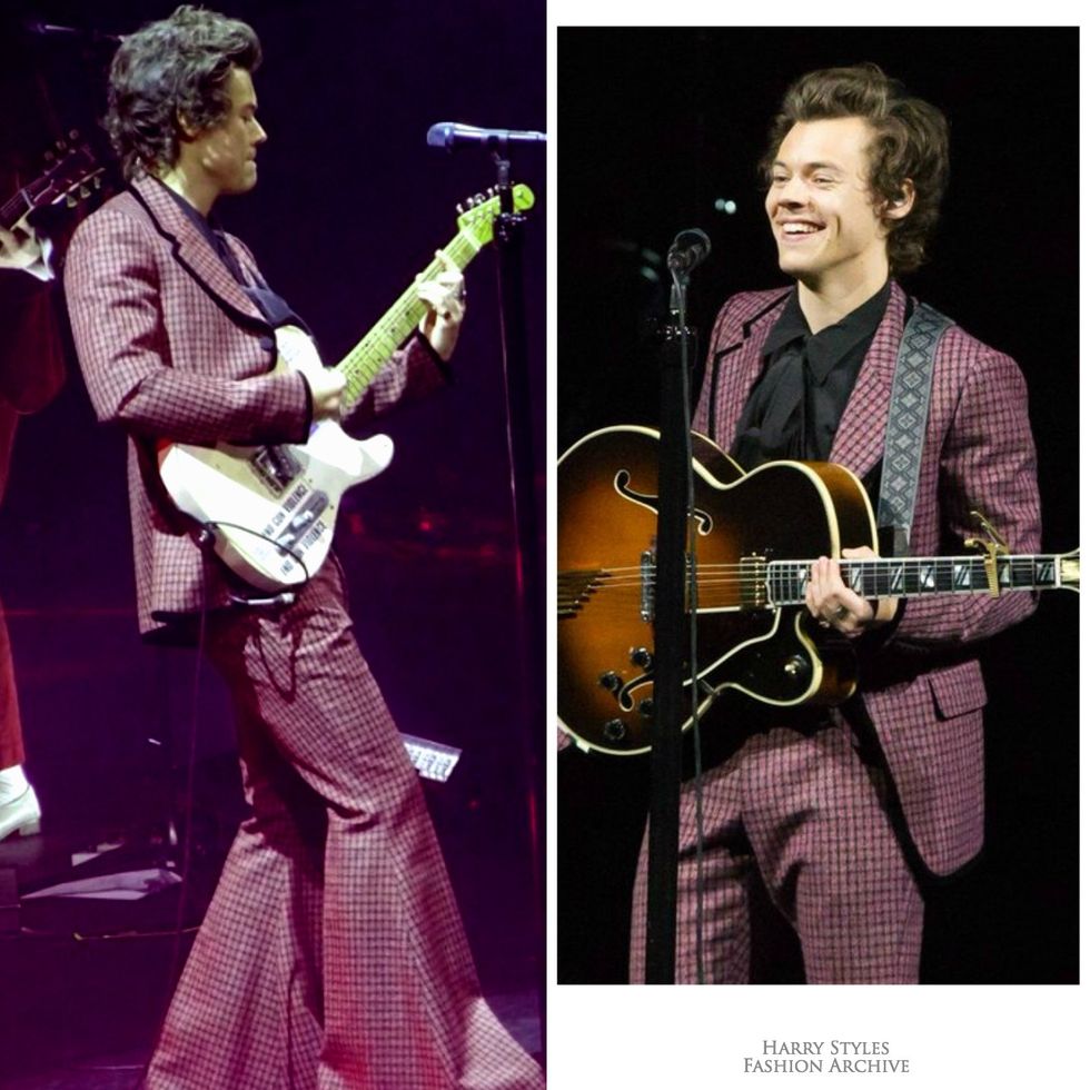 Harry was wearing a beautiful custom Gucci suit for us, personally I was sad he wasn't wearing glitter but I guess I'll get over it. This suit was made of a rose-colored checkered fabric with a black trim and he paired his overly flared pants with some Gucci black leather boots. The next day, he posted a pic of him in a custom red Chicago Bulls jersey that left us all shook.