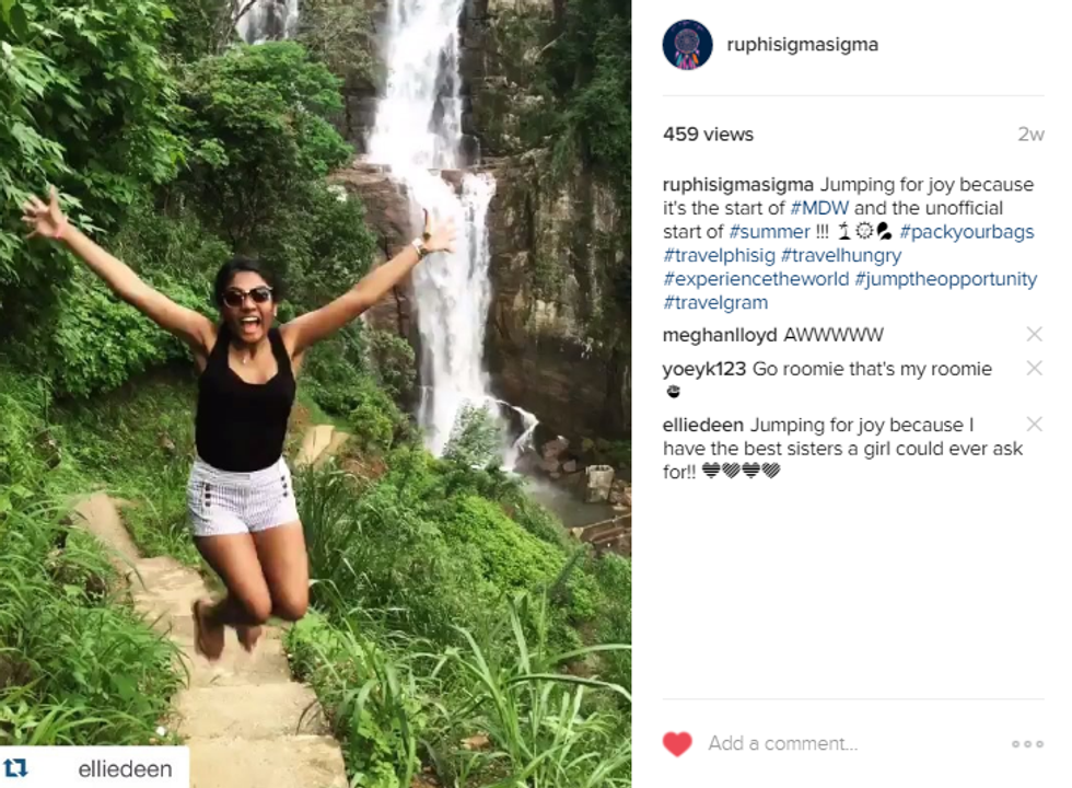Part of building traction is recognizing key words that are relatable to your particular topic. For example, if I was posting about traveling, I would create a list of #hashtags specific to traveling. As the co-chairperson for public relations of my sorority Phi Sigma Sigma, I am responsible for running our Instagram account. One of the ways we keep interest in our sorority during the off-summer months is by generating campaigns, such as the travel picture you can find below. Some of the hashtags I included were pretty self-explanatory like #travelgram and #travelphisig. Others required a little bit of creativity, like #experience the world and #jumptheopportunity. If you aren’t sure what hashtags to use, you can browse Twitter’s search bar by typing in certain words or phrases and seeing what terms appear.