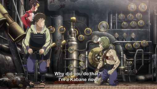 But we get thrown into this world with barely any explanation (the only reason I understood that the kabane’s heart was made out of steel was because I researched the anime’s premises beforehand, but everyone else who I watched with were extremely confused), and the plot is constantly chucking random plot twists at us – like three in one episode that are never completely fleshed out. For instance, in episode one, Ikoma seems to have special moments with both of the female characters that is never explained, the kabane enter the city because of a structural mistake and not because of an epic “bad guy,” and Ikoma chokes himself to death, blood splatters, and then somehow he’s totally fine.