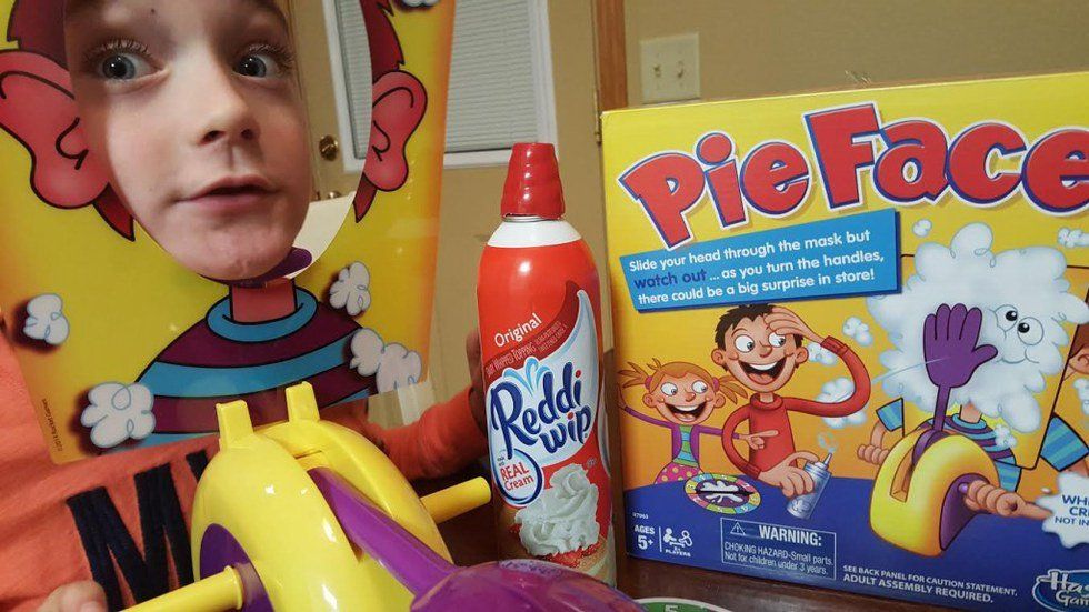 Hasbro actually sold the game in the 1960s, but the CEO said it wasn't as big a hit back then. Explaining why it's a hit now, he said, "It is such a game that is made to be shared, made to be shared virally that it really fits with what consumers are looking for today." This game is a lot of fun for people of all ages (5 ages and up actually!). Hasbro’s comment is true, the viral videos are what gave me the idea on a night when we didn’t know what to do. Excitedly I messaged them, “Guys, we have to get 'Pie Face!'”