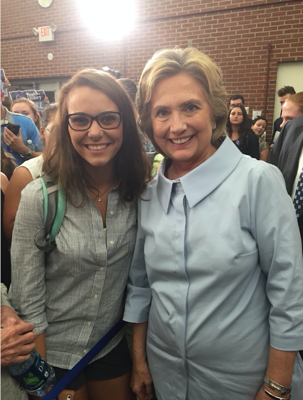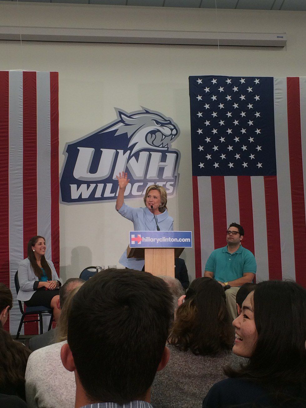 From there I started watching the candidates at public events speaking to crowds, hearing what they had to say. I tried to stray away from social media as I found that it bent the truth, of their direct words. As a UNH student, my school began to host the candidates to publicly speak to citizens in the area. I first heard about Hilary Clinton coming, and I decided to skip my first class (sorry mom) and hear what she had to say. I ended up out of the huge line, managing to get a spot in the small room, listening to different topics targeted in NH area. At the end of her speech I got the opportunity to get a picture with her.