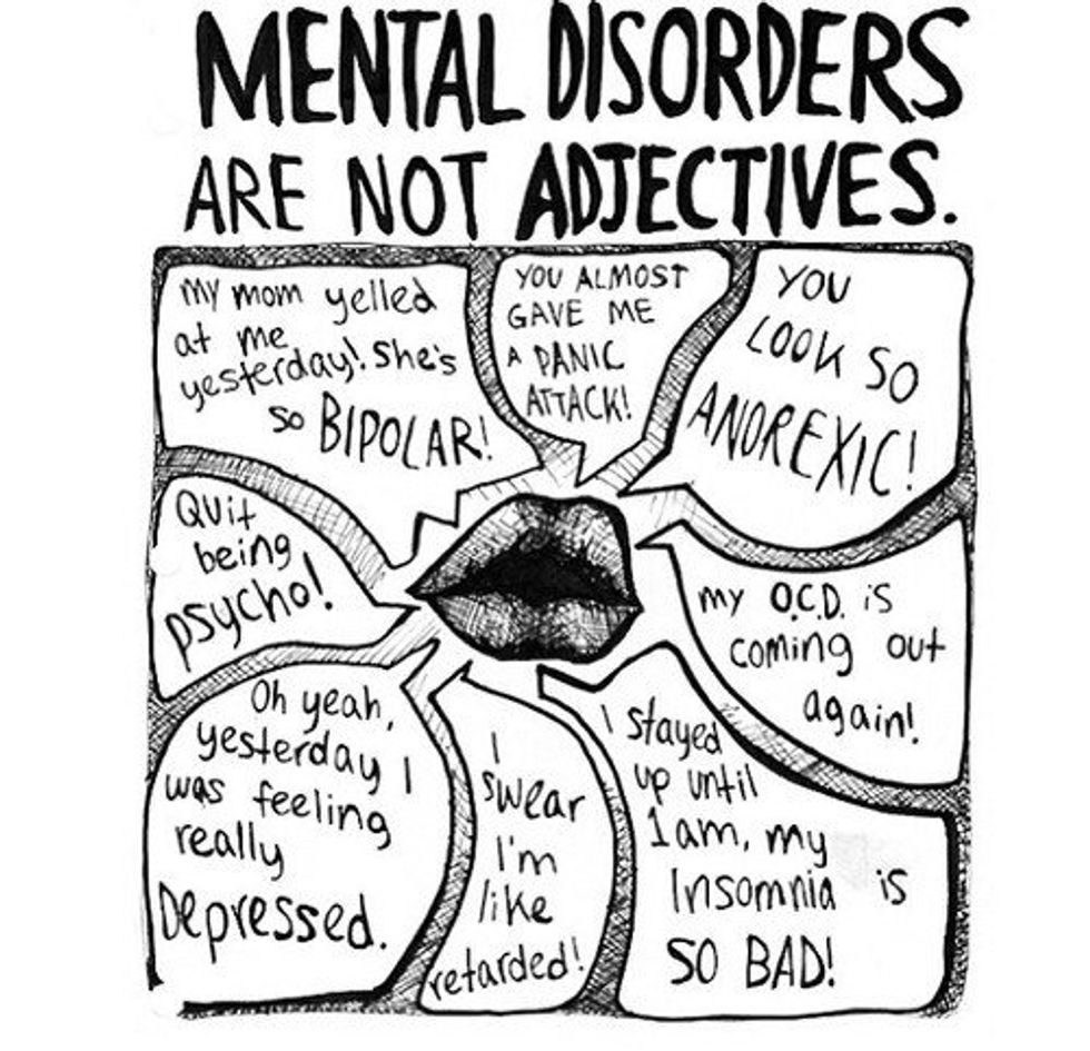 We hear these statement daily, and there is more where it comes from. Because people say it so much, we have become overall immune to understanding it's actual seriousness. Someone might say "I am so bi-polar today" without even thinking about what might mean to the next person. Or another individual could say something along the lines of "I cleaned my bathroom again, talk about Obsessive Compulsive!" and the listener wouldn't think too much about it. For each person, it's different. One might not even hear the comment because we're so used to it, but another might take offense to it because they are part of the population who is battling that specific mental disorder.