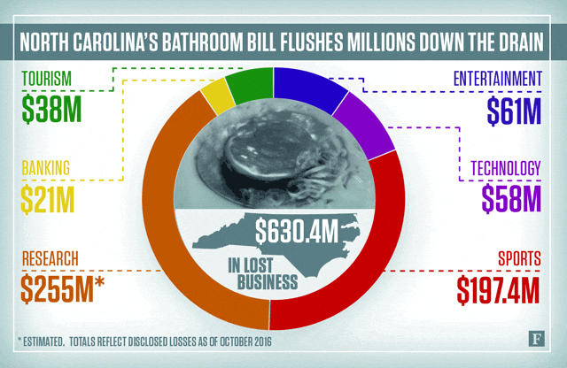 From the law's passing in March of this year to days before the election this past November, Forbes has estimated that North Carolina has lost $630.4 million with $197.4 of those million being related to the loss of sporting events including NBA, NCAA, & ACC tournaments. Forbes also provides a further, detailed breakdown of the losses related to HB2.