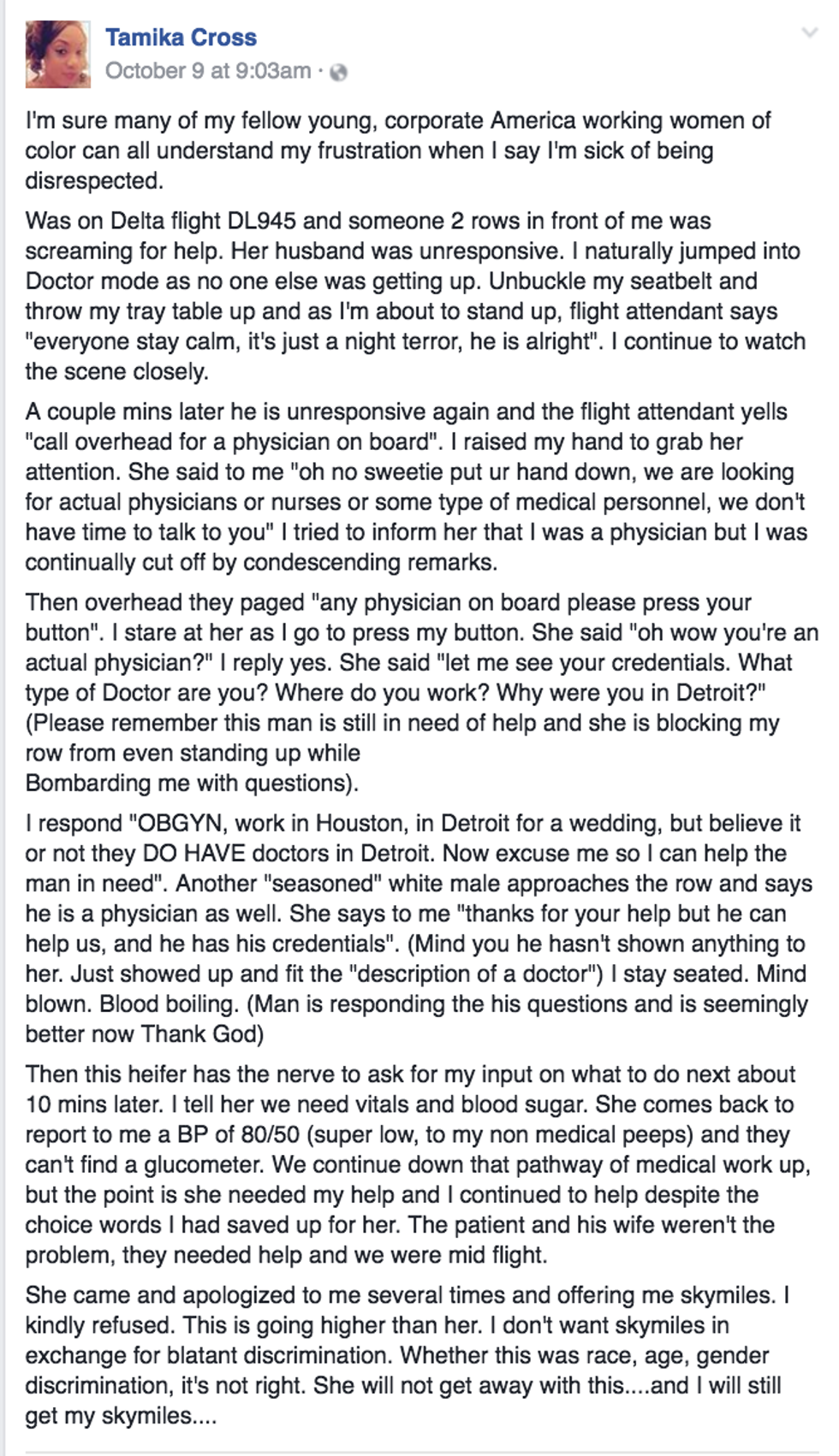 Dr. Tamika Cross was on a Delta flight when a passenger began to have medical problems. The flight crew asked if there were any physicians on board and when Dr. Cross stood up and offered her assistance, she was denied by the flight attendant for lack of credentials. The flight attendant then proceeded to allow a white male physician assist the passenger. You can read her full explanation of the experience below.