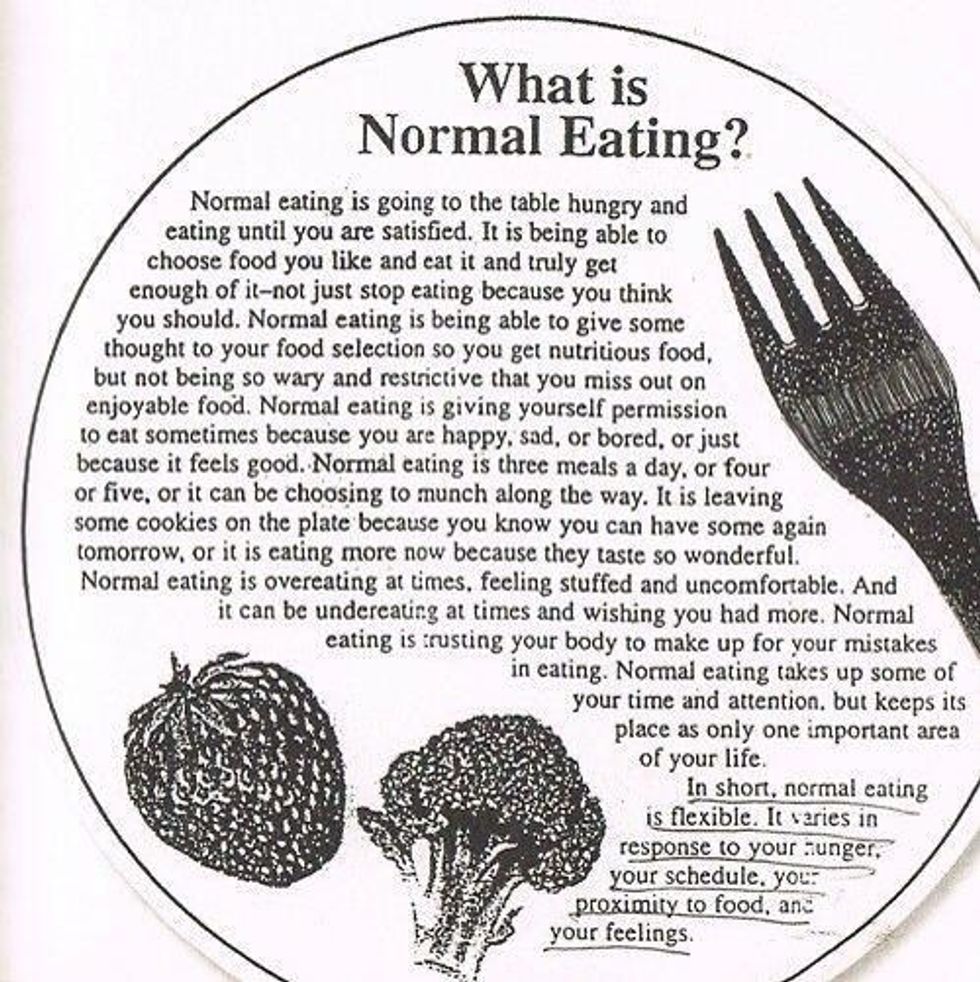 "Normal eating is going to the table hungry and eating until you are satisfied. It is being able to choose food you like and eat it and truly get enough of it — not just stop eating because you think you should. Normal eating is being able to give some thought to your food selection so you get nutritious food, but not being so wary and restrictive that you miss out on enjoyable food.
