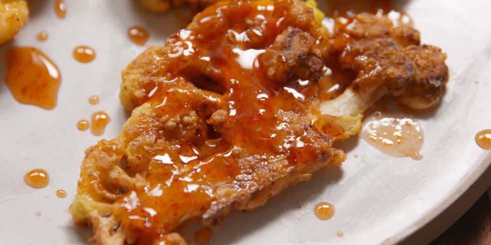 Directions: 1. Slice cauliflower into thick steaks, about 3/4 to 1 inch thick. 2. Place cauliflower into a large skillet and pour water in until it reaches about halfway up the cauliflower. Put water over medium heat and cover the pan and let it steam for 4-5 minutes. Drain the cauliflower and let it cool completely. 3. Put the eggs and flour in separate shallow bowls or plates. Mix garlic powder, paprika and 1 teaspoon of salt in with the flour. Dip the cauliflower into the flour mixture until it is covered completely. Toss the flour-coated cauliflower pieces into the eggs until they're evenly coated, then toss back into flour mixture. 4. Pour 1/2 of vegetable oil into the same, dry, skillet and heat over medium heat. When the oil is heated, add the cauliflower and fry for 2 minutes. Flip and fry for another 2 minutes. 5. Mix together honey and hot sauce and drizzle over the fried cauliflower.