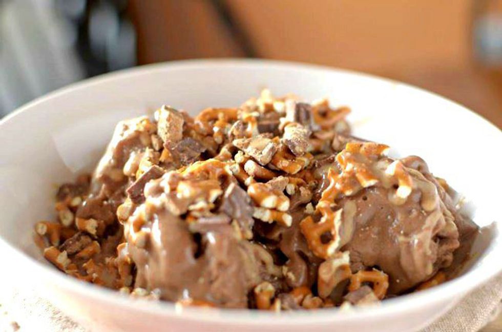 Thaw the bananas partially and add in the cocoa powder and peanut butter into a blender until smooth, freeze the mixture. Once at the right consistency as to what you desire, scoop out and add toppings of crushed pretzels. Finally an ice cream that is healthy and yummy. Besides who wouldn't want to eat cold ice cream on a hot holiday weekend?