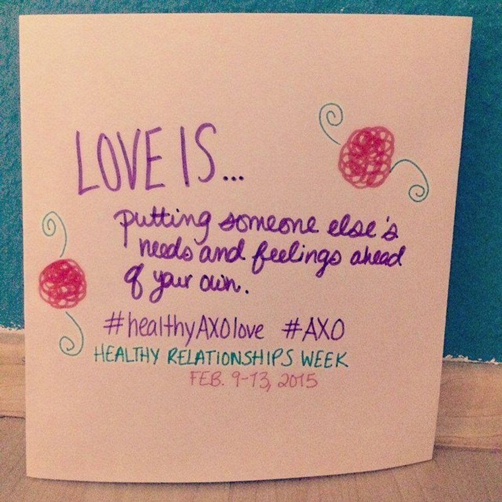 From Monday February 8th through Friday February 12th, Alpha Chi Omega will be recognizing its annual Healthy Relationships Week. The purpose of this week is “to foster the development of healthy relationships and by doing so, prevent domestic violence." Throughout the week, people will participate in various activities dedicated to the education and prevention of domestic violence including my personal favorite, the Love Is Campaign. All you have to do to participate is tweet or post on Facebook your definition of what Love is, photo or otherwise, and use the hashtag #healthyAXOlove to participate in the national campaign.