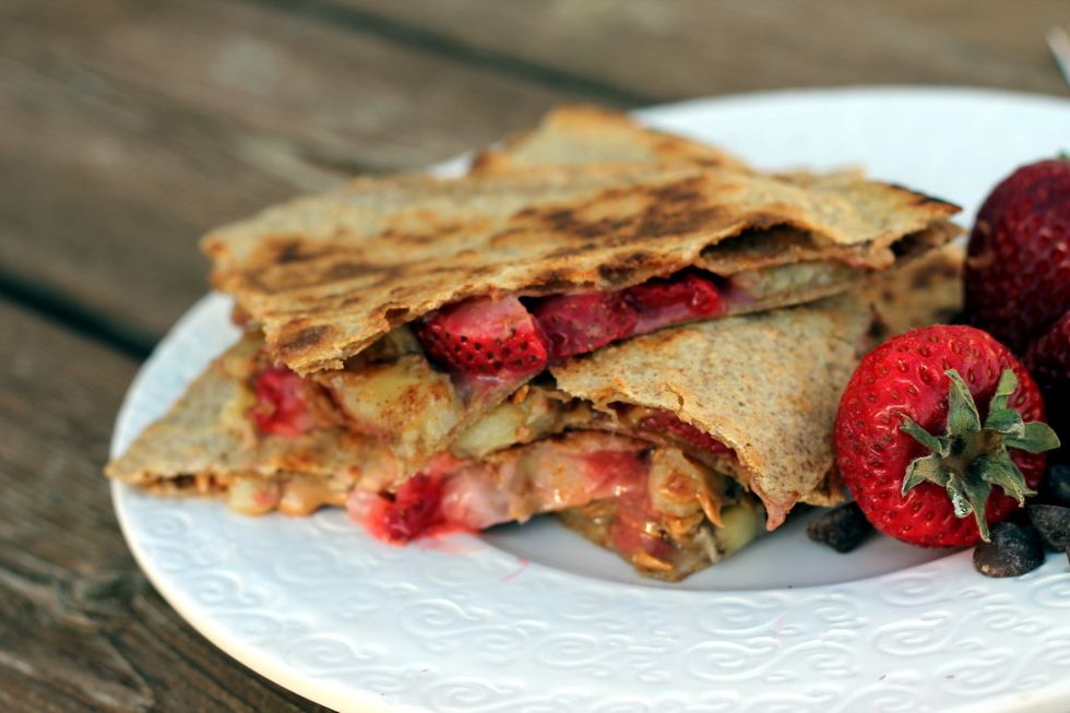Peanut butter is making it’s final appearance in this one. You start out with a tortilla and spread peanut butter on one half and Nutella on the other half. Then, you put some sliced strawberries and bananas in, fold it over, and microwave it until it looks warm and melty and then you have your very own semi-healthy crepe-like thing!