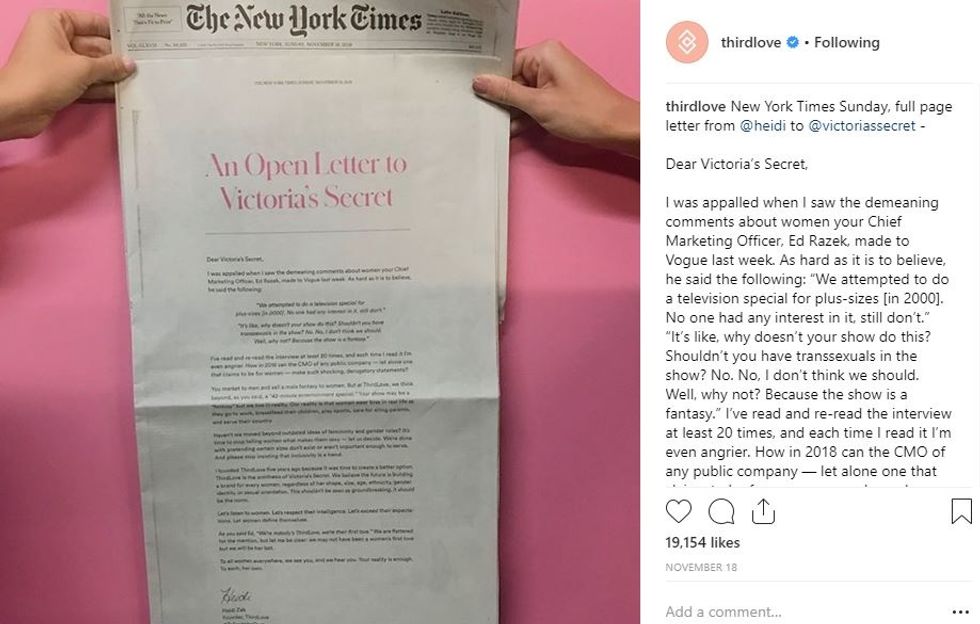 Among the many critics against the once iconic lingerie brand, which was founded in 1977, is ThirdLove CEO Heidi Zak. Zak not only penned an incredibly honest open letter to Victoria's Secret. She also decided to purchase a one-page ad in the New York Times to print that very letter. In the letter, Zak goes on to explain why Victoria's Secret's "male-fantasy marketing tactics, un-inclusive sizing and discriminatory culture" is outdated and why it has inspired antithesis brands like her own to grow in the market.